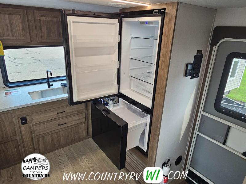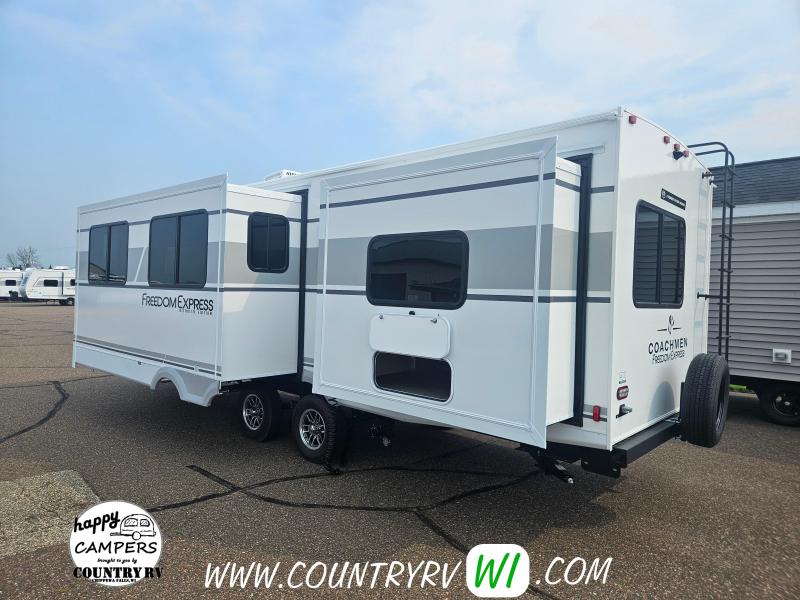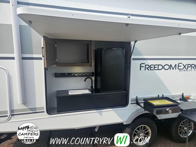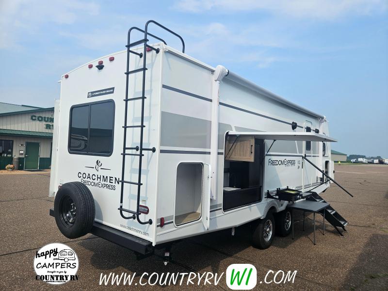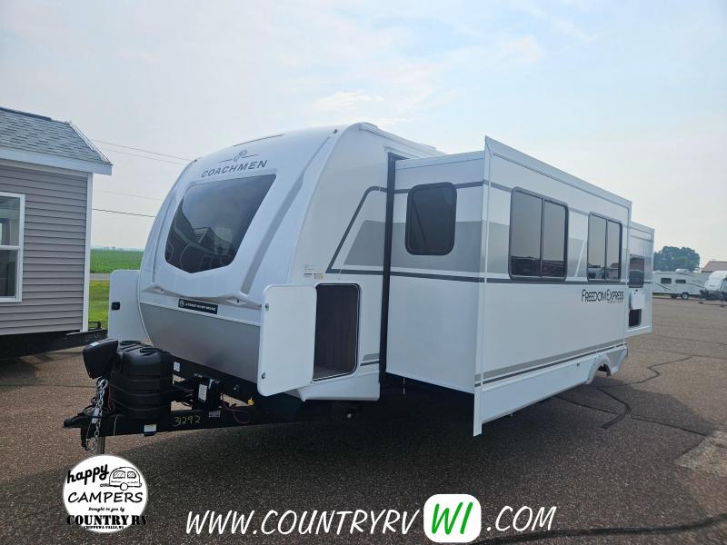 Coachmen Freedom Express 259FKDS Ultra-Light Travel Trailer. This front kitchen layout will offer lots of counter and cabinet storage for only being 29' in length along with an entry closet! The theater seating will make you feel right at home positioned directly in front of your flat screen tv. The grand finale is definitely the KING SIZE BED that slides out to give more space in the bedroom!...And what you don’t find often in a couples unit your very own outside kitchen!