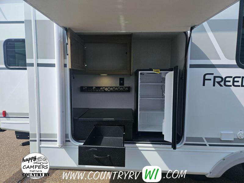 Freedom Value Package: 3/4 Gel-Coated Fiberglass Cap w/ Automotive Glass Windshield, Alumicage Construction, Vacuum-Bonded Walls w/ Azdel Composite Inside & Out (NO DELAMINATION), Aluminum Wheels, Spare Tire Kit, Detachable Power Cord, Power Awning w/ LED Light Strip, Tinted Safety Glass, Front Diamond Plate, EZ Lube & Spread Axle Design, Heated & Enclosed Underbelly, Full Walk-On Roof, Tufflex PVC Roofing, Exterior Shower, Winterization-Ready Kit, Black Tank Flush, Ducted Furnace, Ducted Ceiling A/C, Magnetic Baggage Catches, 24x48" Resin Outdoor Table, TV & Radio Antenna (WiFi/4G Prep), Exterior TV Hookup, Freedom Solar Ready, Backup Camera Prep, Battery Disconnect, Aluminum Solid Steps, Pet Leash/Bottle Opener, 81" Interior Height, Bluetooth Speaker, LED TV, LED Interior Lights, Night Shades, Hidden Hinges, Sink Cover, Microwave, Oven w/ 3-Burner & Glass Top, Double-Door Refrigerator, Utensil Drawer, 60x80 Residential-Size Queen Bed, USB Ports, Skylight/Power Vent in Bath, Porcelain Toilet, Friction-Hinge Entry Door, Tankless Water Heater, 15K A/C, and Freedom Vault Bed Storage. Ultra-Light Express Package: Power Tongue Jack, Griddle, Side Table, Ladder, and New Bedroom Shelf for any sleeping devices (e.g., CPAP machine).
