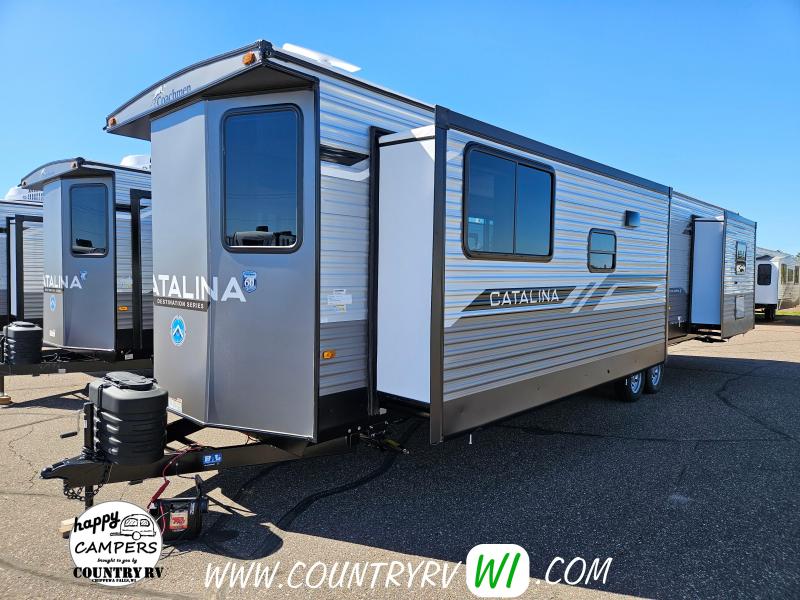 Coachmen Catalina Destination 39MKTS Travel Trailer features a wonderful spacious and open living area! The front of this unit has the bay windows on either side of the entertainment center that is accented with a fireplace and brick look for a cozy warm feeling. The two recliners paired with the trifold sofa are great for comfortable and relaxing seating along with the tri fold sofa for extra sleeping space. The island kitchen with pantry and hutch area also adds to the great counter space! This unit is a must see!