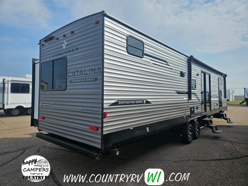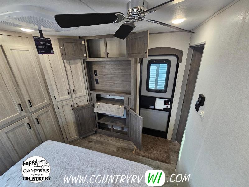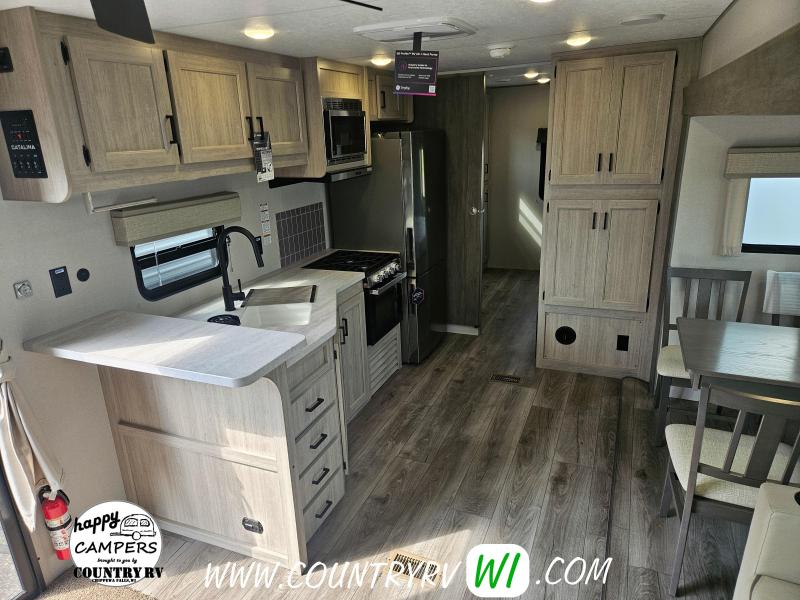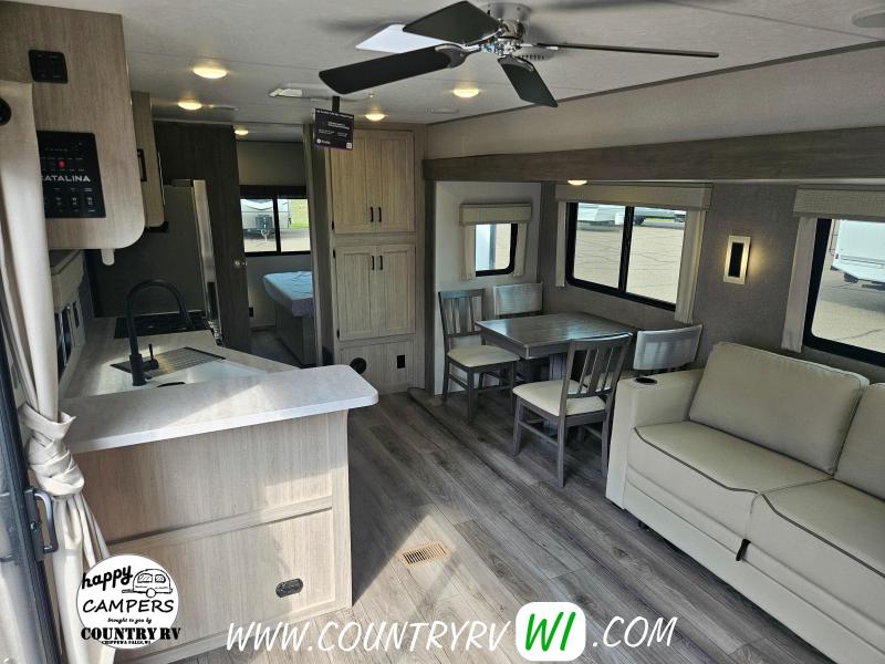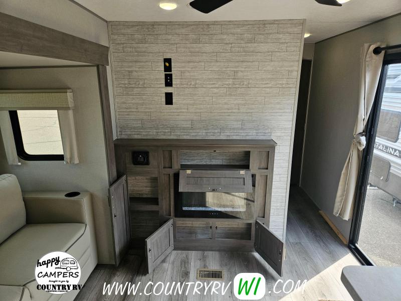 Catalina 40BH-2Q offers a 2 Bedroom FLOORPLAN!! This classic floorplan has an amazing twist to make it the ultimate layout for a couple who have family & friends that visit often and want to offer them a queen size bed! So many awesome things about this layout that you have to truly see it for yourself. The two queen beds are at opposite ends to give more privacy and each one on its own slide out. Both rooms have their own wardrobe storage but the master bedroom in the front gives you so many storage options. The living room comes set up with a freestanding table with 4 chairs, fireplace, tri-fold sofa & residential refrigerator. Perfect seasonal set up that covers all the bases. Definitely a must see!