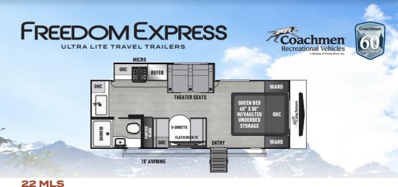 Introducing the NEW Freedom Express Ultra Lite floorplan 22MLS, featuring an innovative layout that maximizes comfort and convenience while keeping length and weight down. This exceptional design includes a residential 60x80 queen-size bed, cpap shelf and power source, recliners, rear kitchen & dinette for extra seating/sleeping space when needed. Experience the perfect blend of style and practicality from the amazing team at Freedom Express!