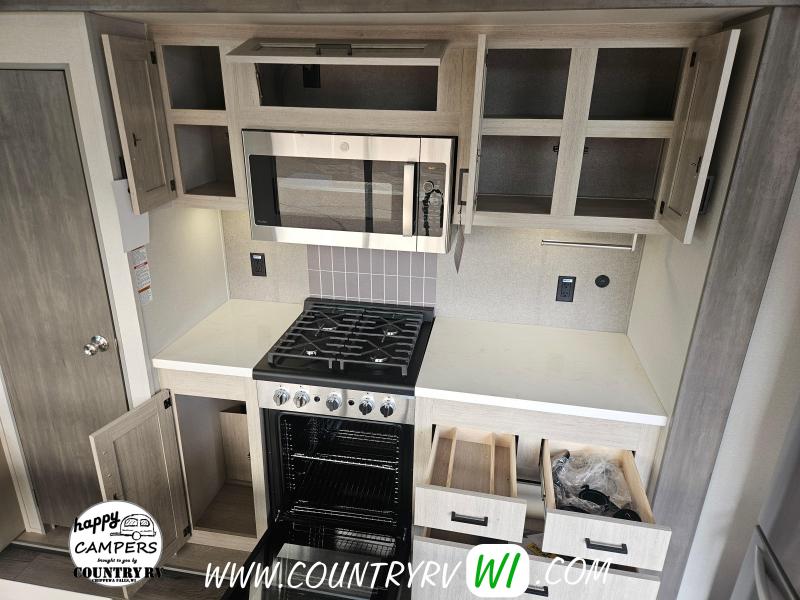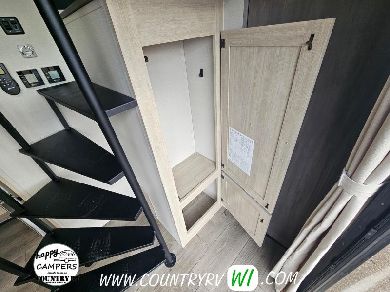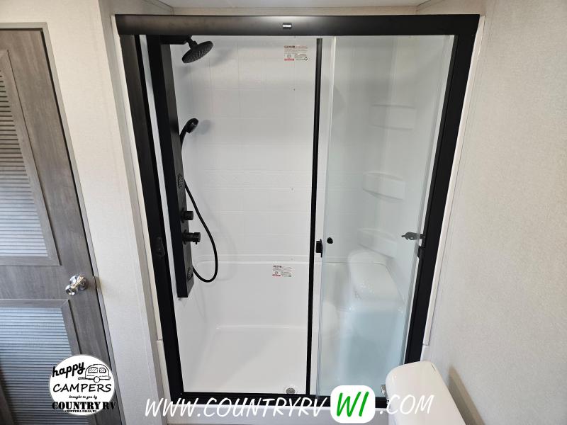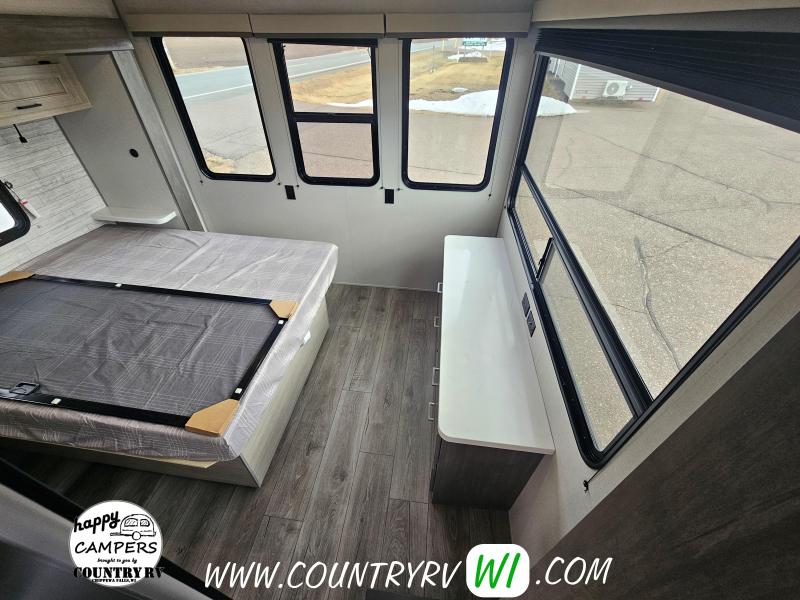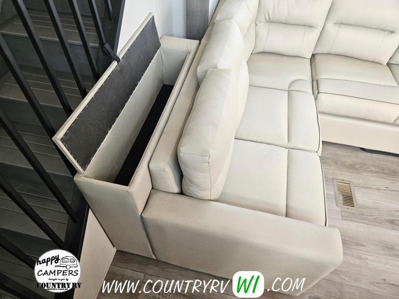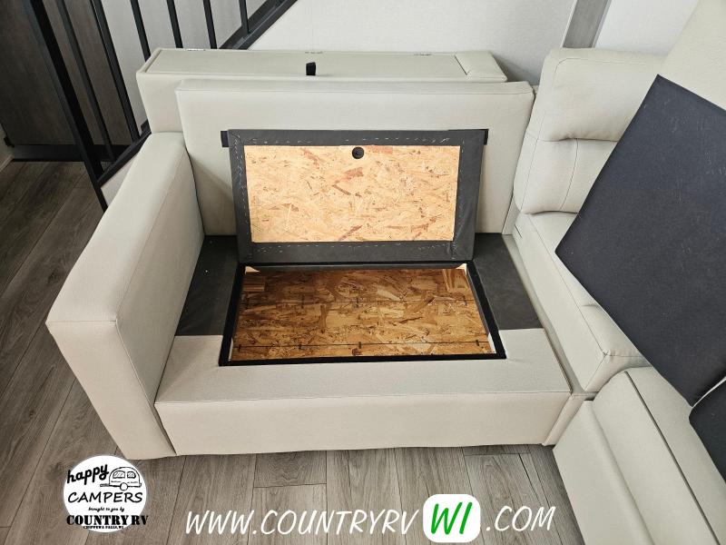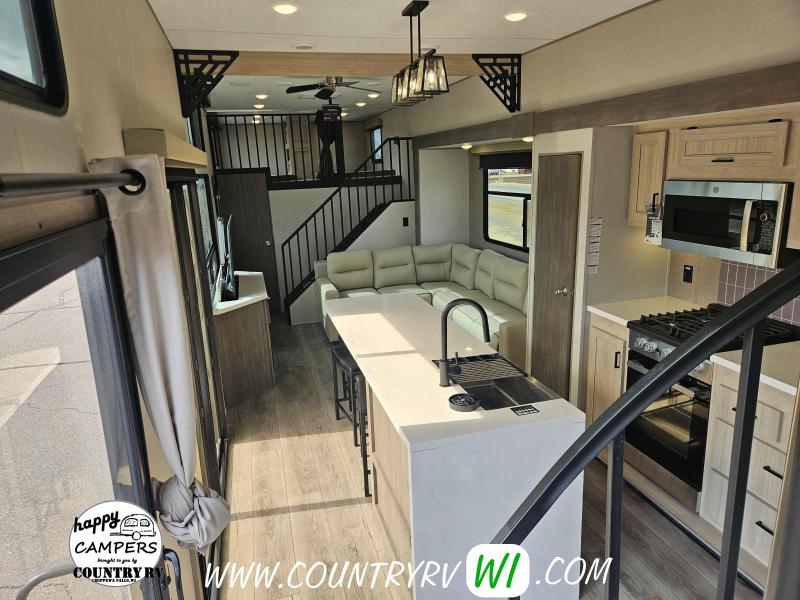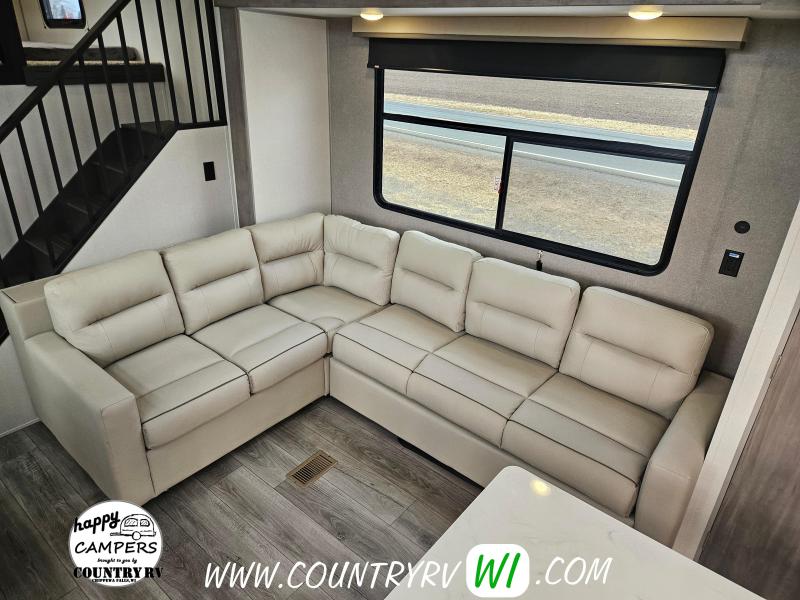 The 2026 Catalina 42 Condo introduces an innovative floor plan that maximizes sleeping capacity while preserving an open, couple-friendly layout. The lofted area comfortably sleeps up to five and features clever storage solutions, making it ideal for families or groups. At the front, the private bedroom includes its own slide-out, creating a spacious retreat enhanced by a cozy fireplace that adds warmth and charm. The island kitchen offers generous countertop space, ample storage, and residential-style features that elevate your culinary experience. The living area is filled with natural light from abundant windows and includes a smart entertainment setup—complete with a TV that discreetly lowers into the cabinet when not in use. A large sectional sofa adds comfort and converts into a massive sleeping area, perfect for hosting guests. Step down into the rear bathroom and you’ll find a roomy shower, plenty of floor space, and washer/dryer prep that can also serve as extra storage. This thoughtfully designed unit redefines destination camping with comfort, creativity, and functionality—perfect for making the most of your seasonal adventures.