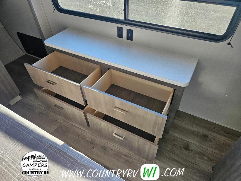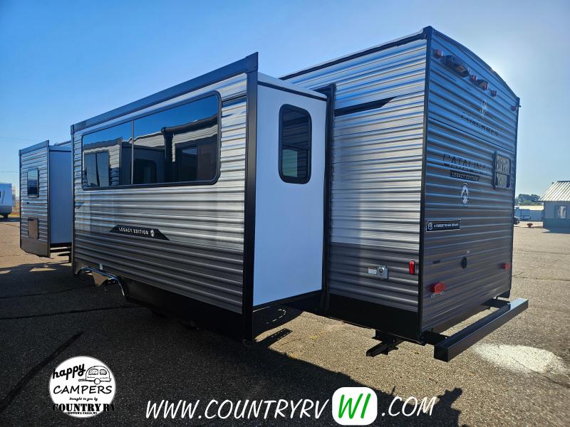 2026 Catalina Legacy 303RKDS Travel Trailer offers more punch for the package than most. The rear kitchen with a U shaped counter provides great counter space as well as multiple upper & lower cabinets. The door side view in the living room is an uncommon feature which allows for a great look into your site from the dining table & sofa. Don't forget about the two individual recliners that can move independently so you can each person can choose their view. The large bathroom with XL shower is a people pleaser, the added linen cabinet also helps maximize storage. Finally but some might say the best part is the bedroom. The bed slide, large closets offer any type of storage you could need not to mention an area for washer & drier if so desired.