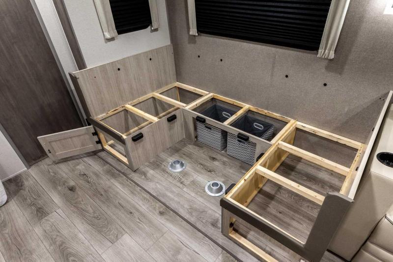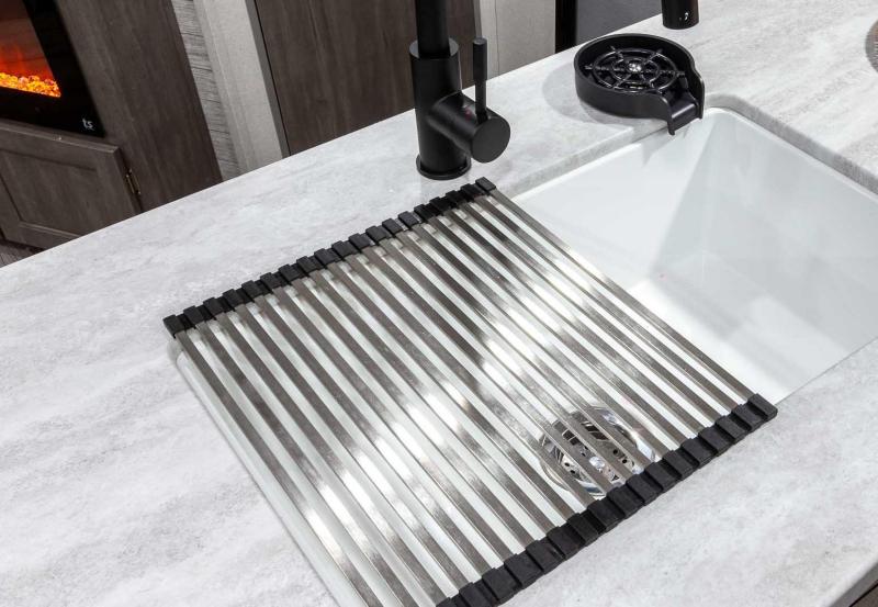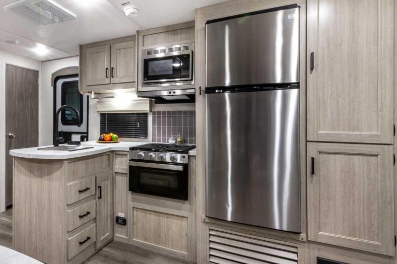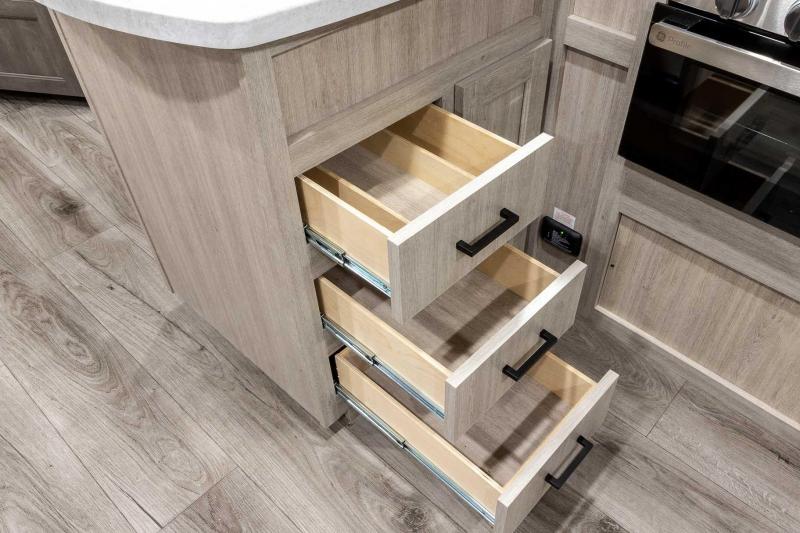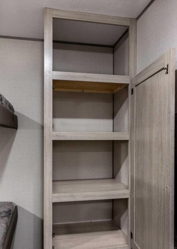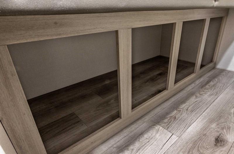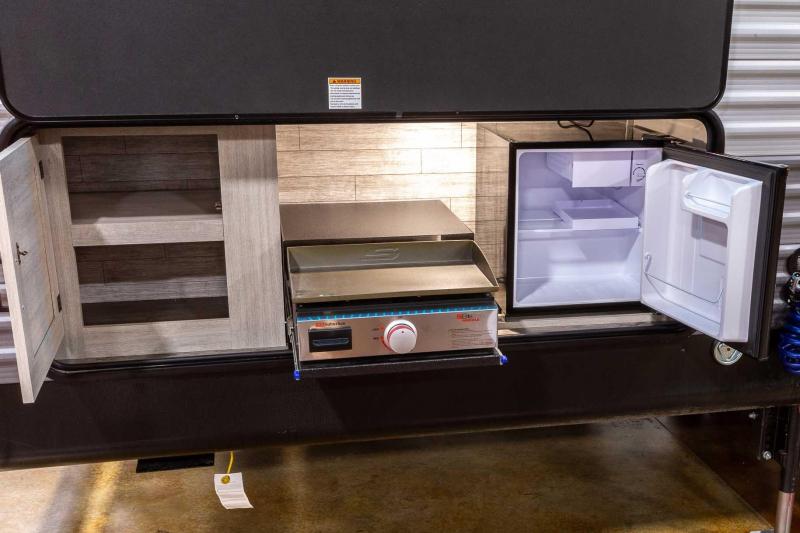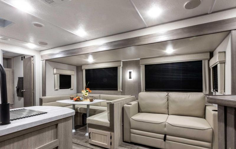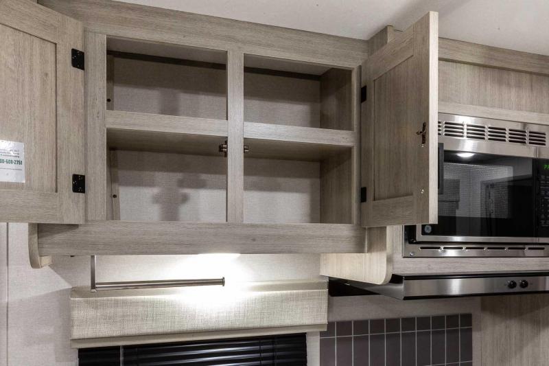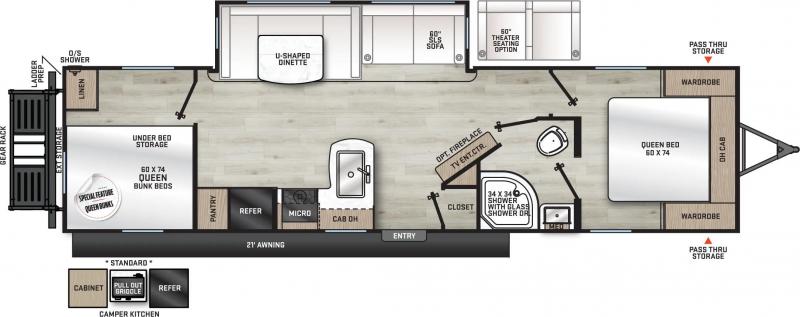 Exterior Features: Flip Down Cargo Rack w/200 lb. Capacity (N/A 283EPIC) Electric Awning w/Multicolor LED Strip & Remote Black Tank Flush Battery Disconnect Switch Siphon 360 Holding Tank Roof Vent Electric Tongue Jack Hot/Cold Outside Utility Shower w/ Hands Free Holder (2) 20 lb. LP Tanks Black ABS LP Bottle Cover LP Quick Connect Flush Mount Baggage Doors w/Radius Corners Diamond Plate Rock Guard Stabilizer Jacks G20 Tinted Privacy Windows Premium JBL Exterior Speakers Friction Hinged Black Glass Entry Door with Window Exterior 110V G.F.C.I Protected Receptacle Exterior RG-6 Coax Cabling and Satellite Prep Exterior TV Hookup Rain Gutters with Drip Spouts MORryde StepAbove Solid Steps (Main Entrance Only) Safe-T-Rail Door Assist on Main Entry Door Rear View Camera Prep Exterior Camp Kitchen + Storage (263BHSCK, 293QBCK, 293TQBS) Bottle Openers (Exterior Camp Kitchens) Pets - "Leash Link" Quick Hookup D-Ring Universal Solar Prep w/Roof & Chg. Controller Connections & Wiring Rear Ladder Prep INTERIOR FEATURES: All-In-One Control Panel with Dimmer Switch Premium Audio JBL Aura Cube Multi-Zone Function Media Center Premium JBL Interior Speakers GE Stainless 10.7 Cu. Ft. 12V Refrigerator (N/A 323MAZE) Seamless Thermofoil Countertops Throughout Deep Basin Farm Style Sink Residential-Style Kitchen Faucet w/Pull Down Sprayer Stainless Steel Drying Rack High Pressure Glass Rinser Paper Towel Holder GE Stainless 3-Burner Gas Range with Metal Back-Lit Knobs Range Hood Brick Style Backsplash GE Stainless Microwave W/Glass Turn Table Congoleum Woodplank Linoleum Flooring 4000 Lumin LED Interior Touch Lighting SLS (Sit-Lounge-Sleep) Sofa with Interior Storage Designer Wall Lighting Main Slide Room Hard Valance Window Treatments Pedestal Thermofoil Dinette Table Under Bench Dinette Storage (Per Floorplan) Easy Access Booth Dinette Storage Doors 12V 14" Living Room Power Vent Fan 12V 14" Bathroom Power Vent Fan Marine Toilet with Foot Flush ABS Tub/Shower Surround w/Shelves Shower/Coat Hooks Skylight Above Tub/Shower Glass Step-In Shower w/ABS Surround (Per Floorplan) Medicine Wall Cabinet with Mirror Bedroom Surface Mounts USB Ports (Each Night Stand) Kitchen USB's & Outlets USB Surface Mounts Near Bunk Beds Solid Master Bedroom Door(s) (Per Floorplan) Solid Bunk Room Door (Per Floor Plan) Full Length Night Stands with Shelves (N/A Bed Slide-Outs)” Mirrored Wardrobes in Master Bedroom Master Bedroom Overhead Cabinets Underbed Storage w/Separation from Outside Front Storage Designer Fitted Master Bed Sheet Full Lino in Slide-Outs and Bedrooms (Carpetless)