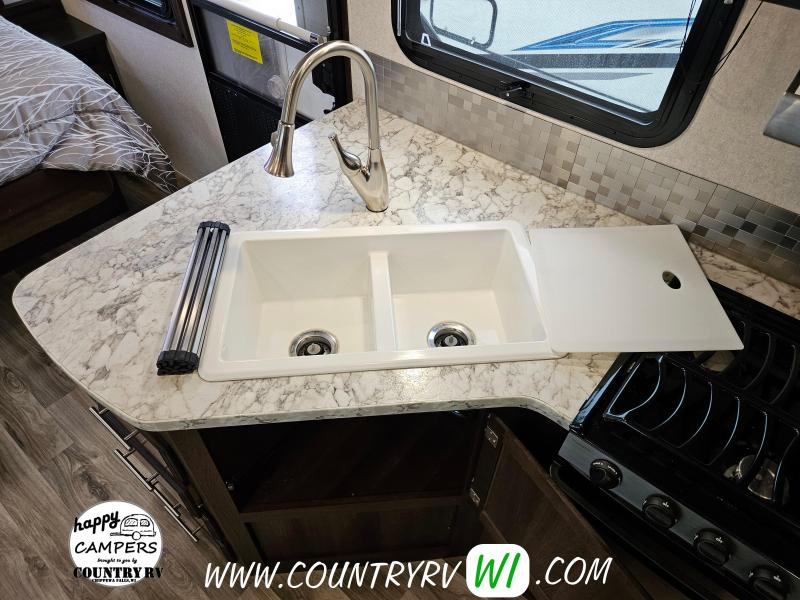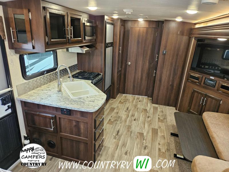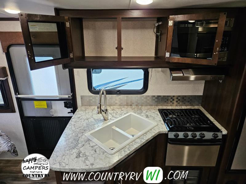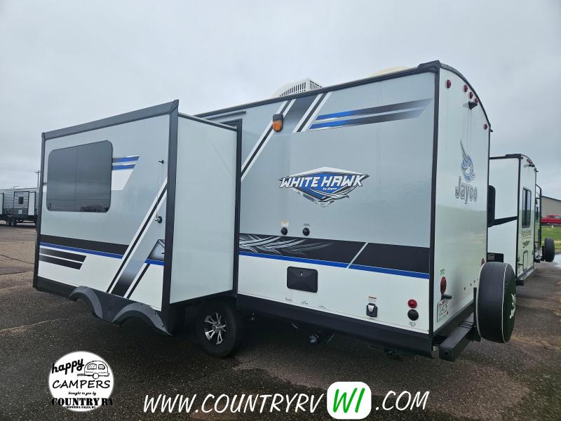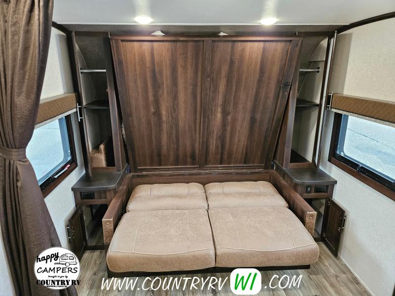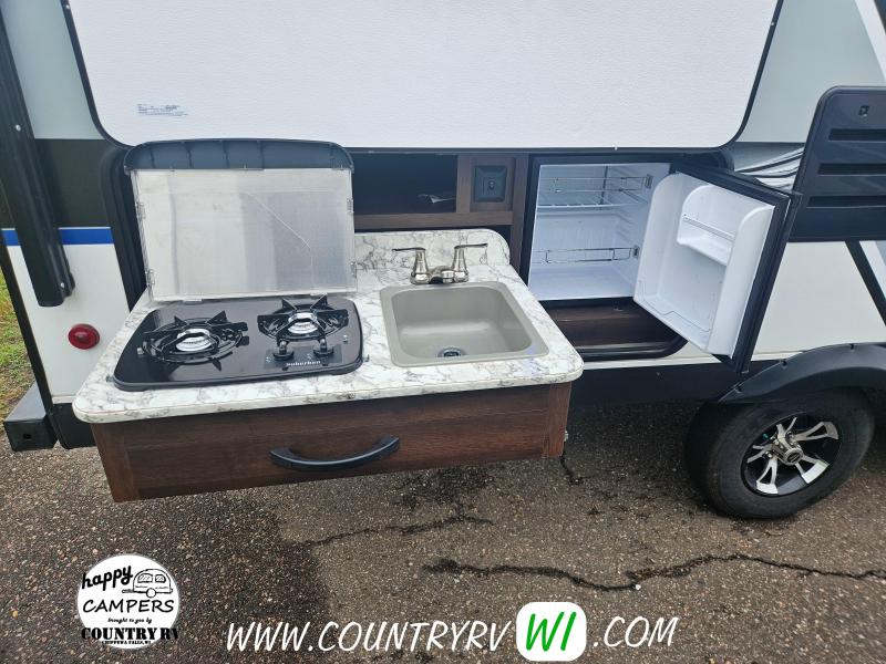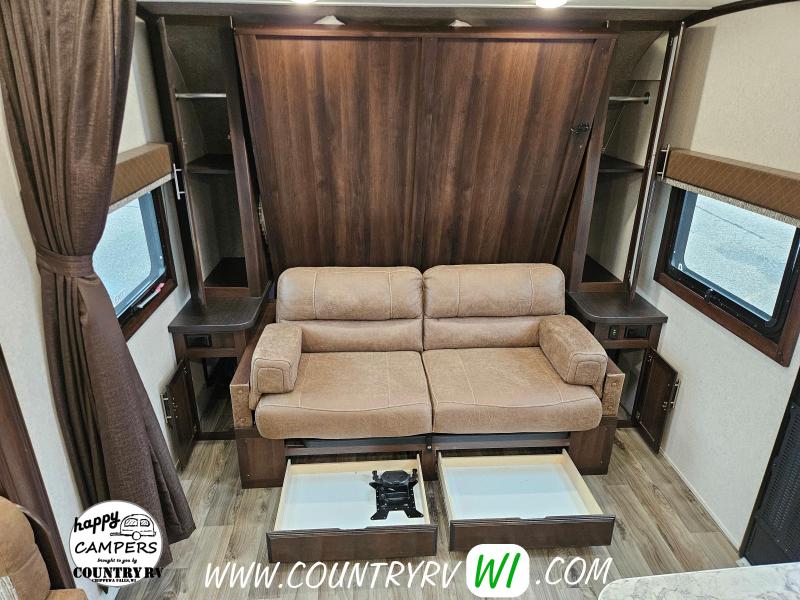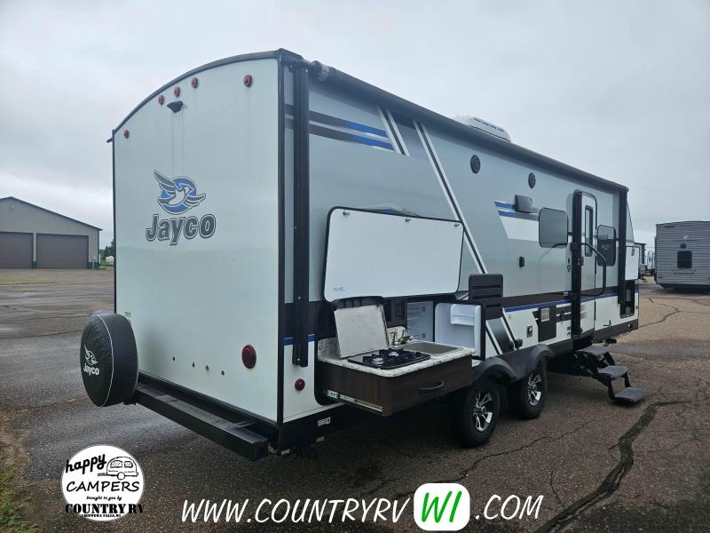 The 2018 Jayco White Hawk 23MRB offers a timeless floorplan with a clever update. As you step inside, you’ll immediately notice the absence of a walled-in bedroom—giving the entire camper a much more open and spacious feel. That’s thanks to the Murphy bed, which folds up into the ceiling to reveal a comfortable sofa underneath, creating extra seating space when you're not sleeping. The large L-shaped dinette provides plenty of room for guests or a perfect spot to kick back and watch TV on a rainy day. Outside, you’ll find a well-equipped outdoor kitchen featuring a sink, refrigerator, and cooktop—perfect for cooking under the open sky.
