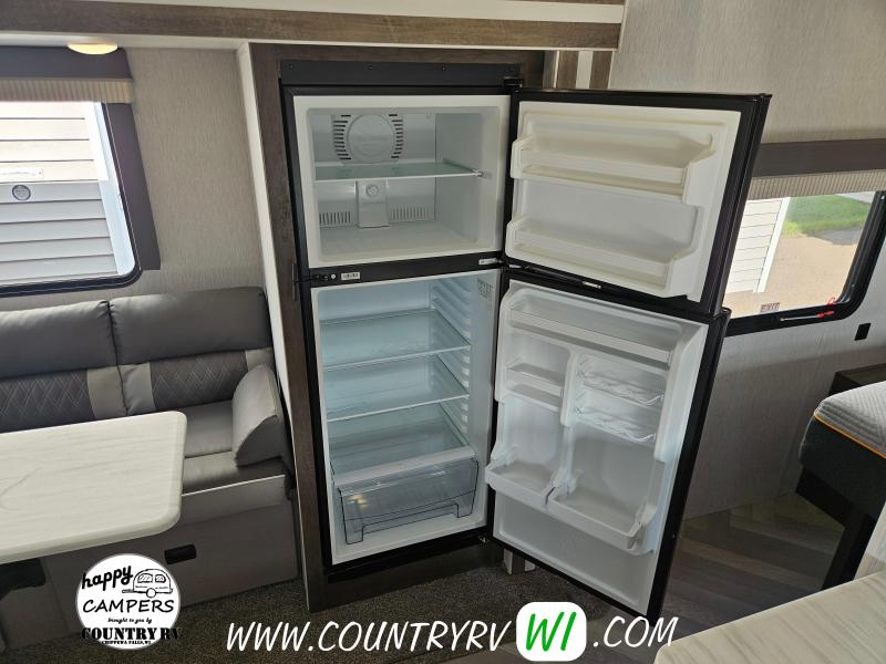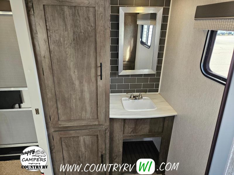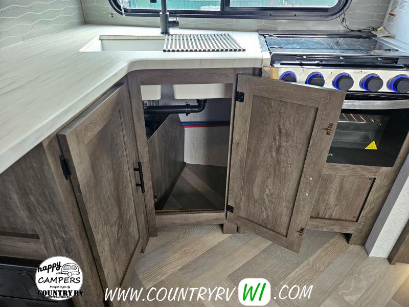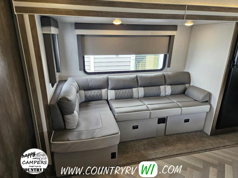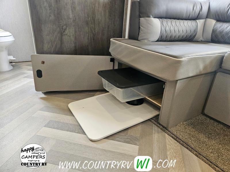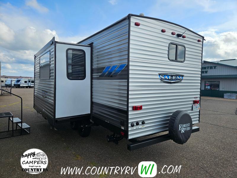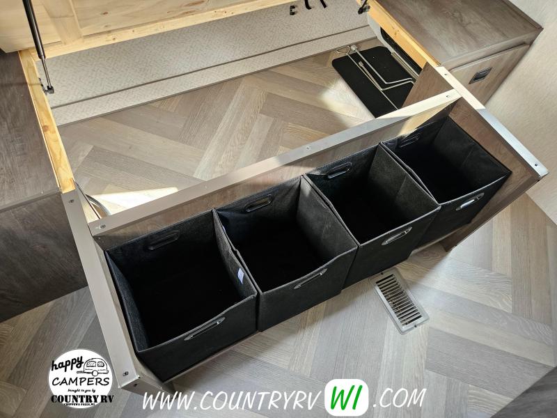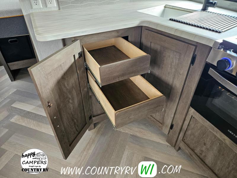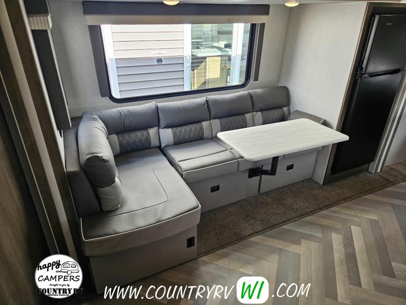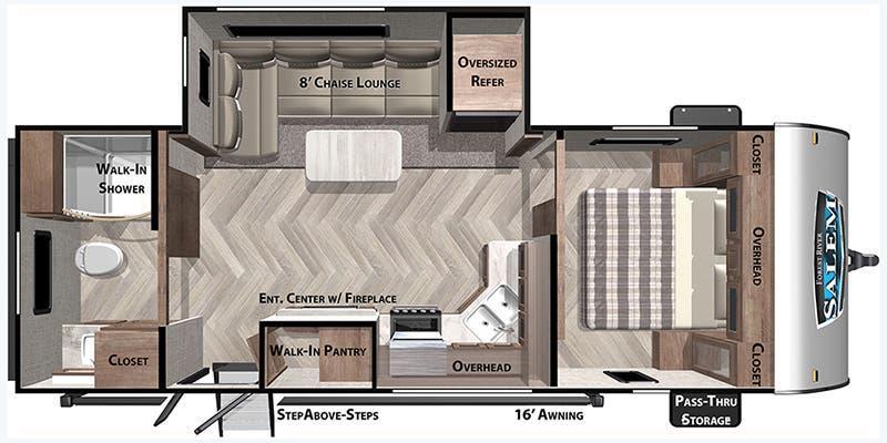 The 2022 Salem features a spacious rear bath with a full linen closet and a roomy shower. Just inside the entry, you’ll find a handy closet with built-in shelving. The large L-shaped sofa not only provides extra seating and sleeping space but also includes cabinet doors below with a pull-out storage bin and dedicated table storage. The 10 cu. ft. refrigerator gives you more space than most traditional camper fridges, while the four totes under the bed offer clever storage solutions. Plus, a built-in laundry hamper keeps dirty clothes neatly tucked away in the outside pass-through storage.