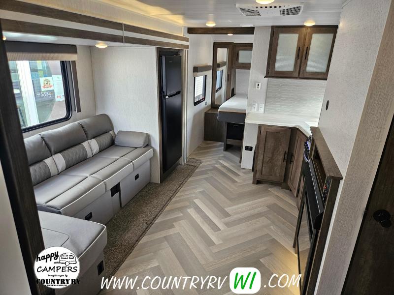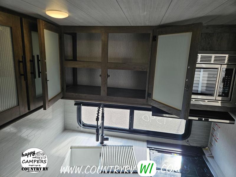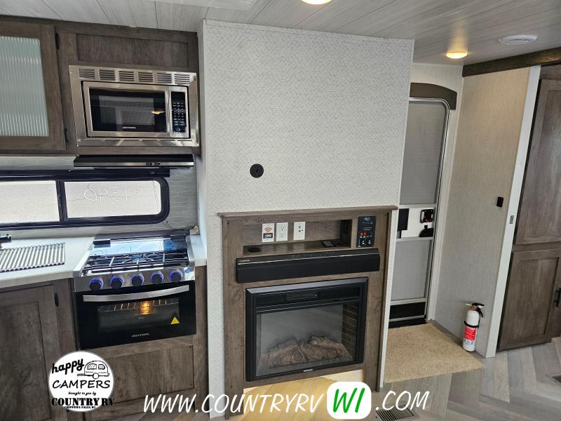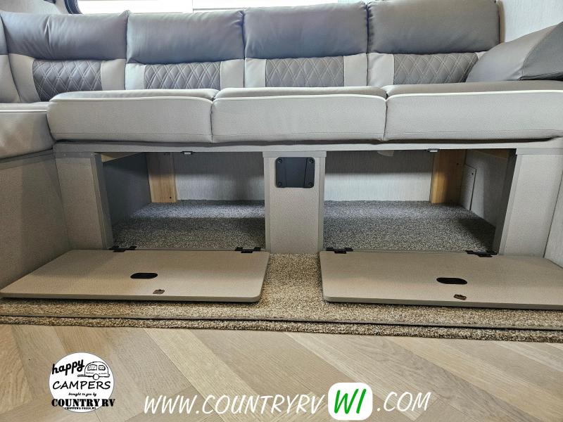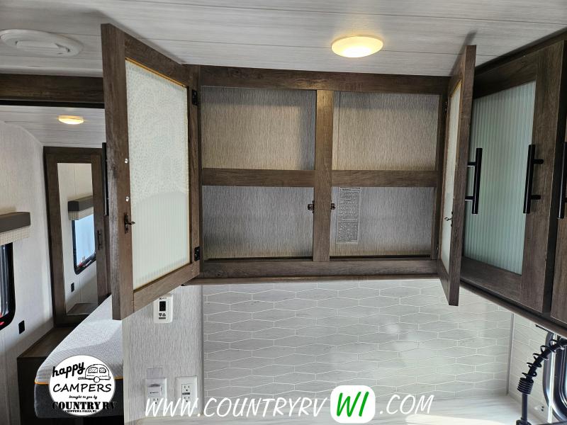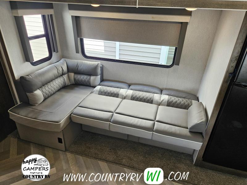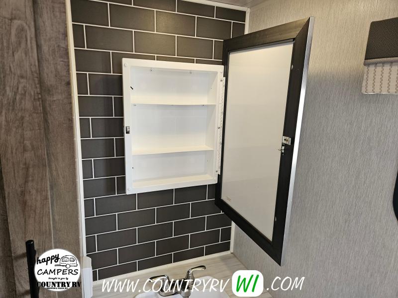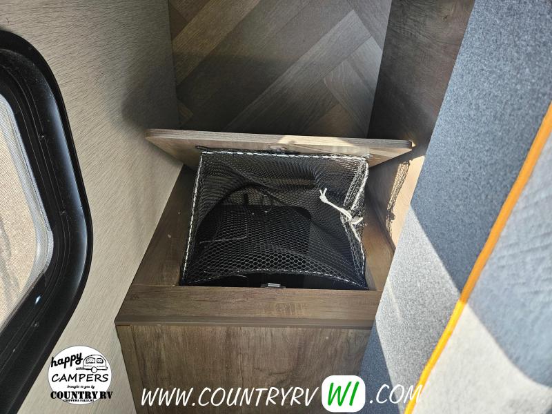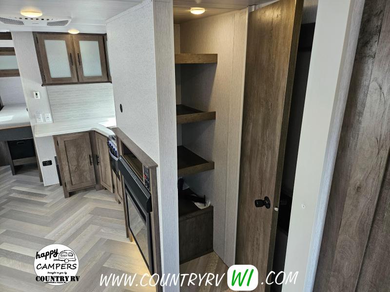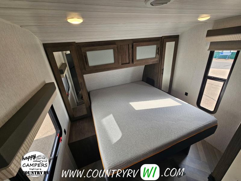 The 2022 Salem features a spacious rear bath with a full linen closet and a roomy shower. Just inside the entry, you’ll find a handy closet with built-in shelving. The large L-shaped sofa not only provides extra seating and sleeping space but also includes cabinet doors below with a pull-out storage bin and dedicated table storage. The 10 cu. ft. refrigerator gives you more space than most traditional camper fridges, while the four totes under the bed offer clever storage solutions. Plus, a built-in laundry hamper keeps dirty clothes neatly tucked away in the outside pass-through storage.