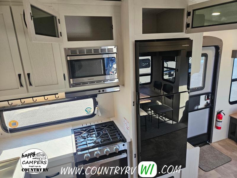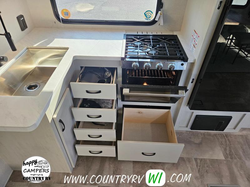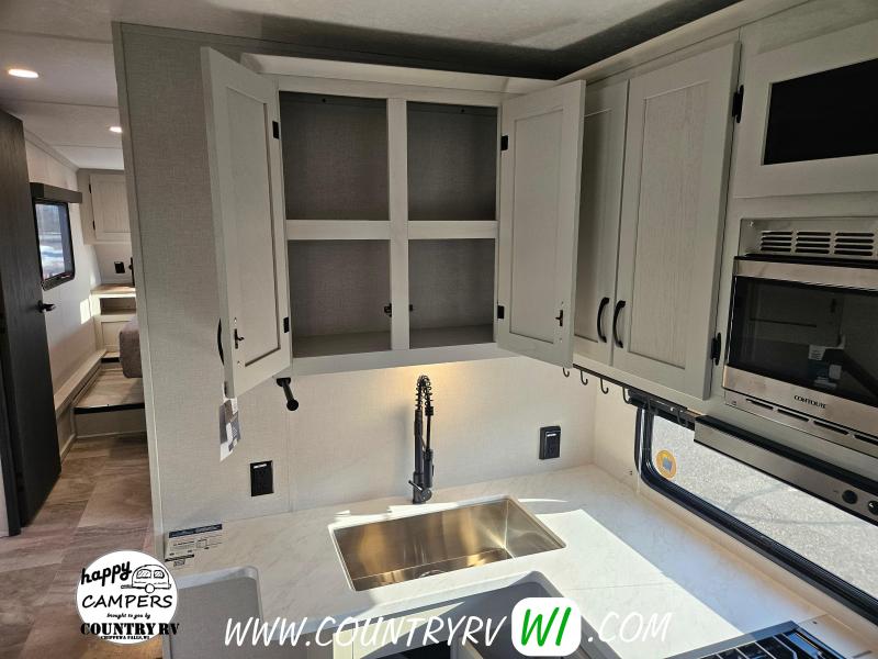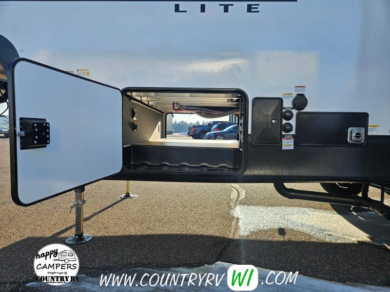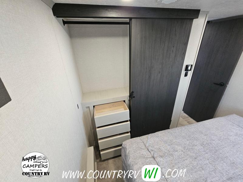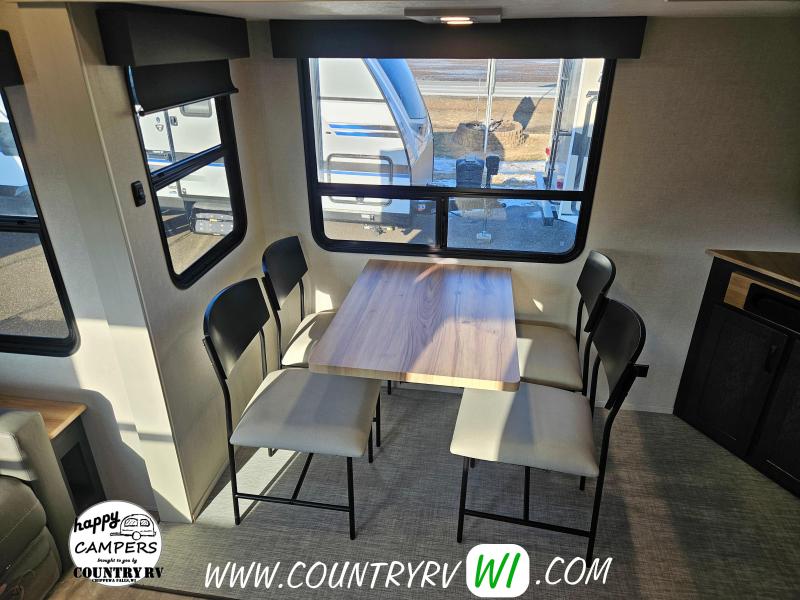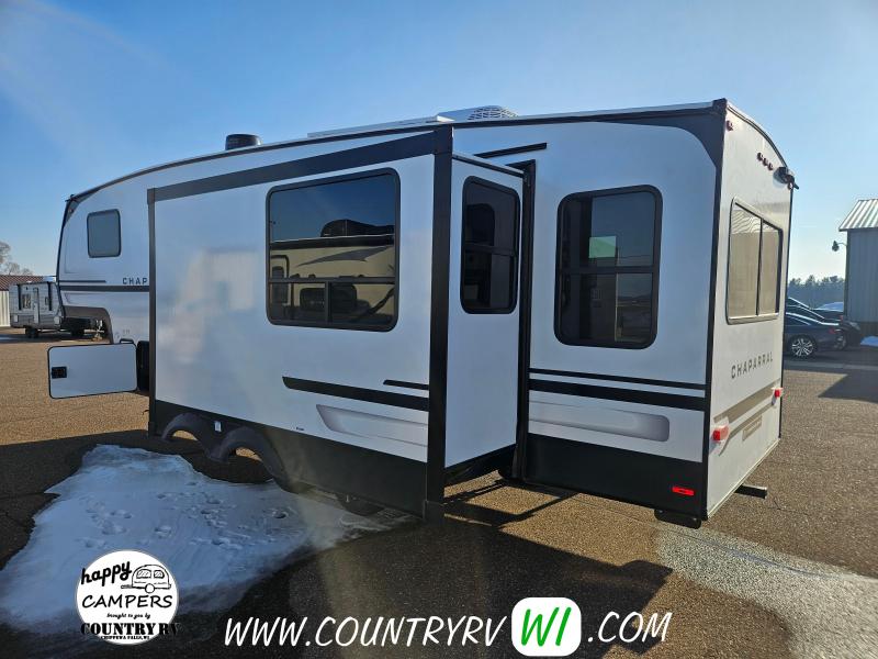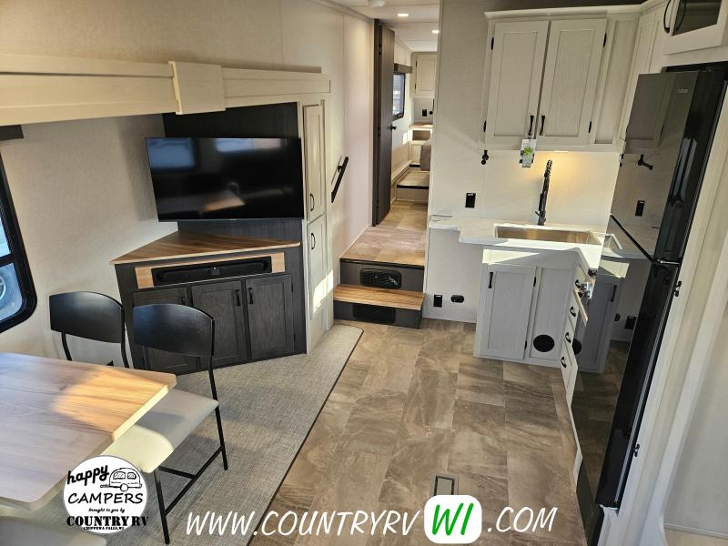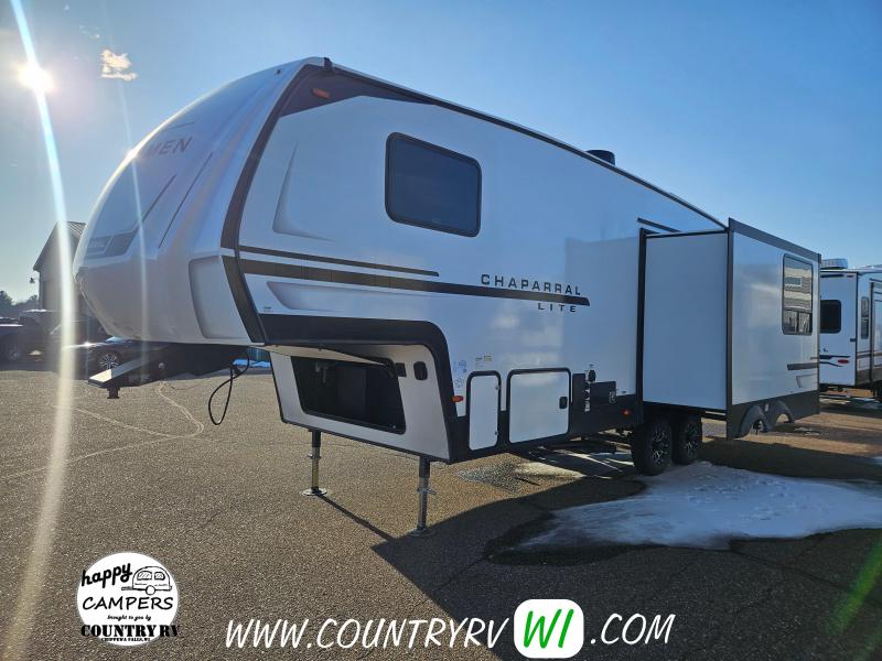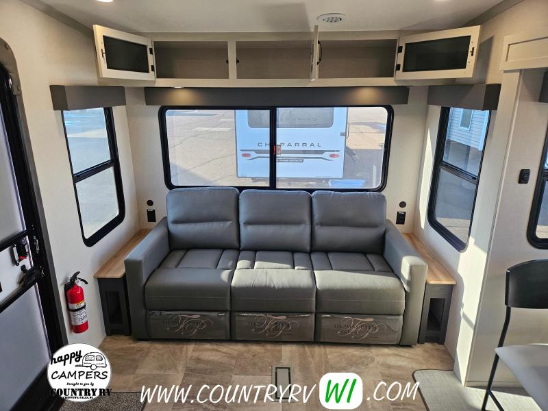 The Chaparral Lite introduces a new rear living floorplan for this year—new to the lineup but a layout that was extremely popular in past years. The rear sofa setup provides a great view of the corner entertainment center, and when guests stay over, the large hide-a-bed adds extra sleeping space. The freestanding table is a great feature for couples, allowing you to move the seating area wherever it feels most comfortable. The corner kitchen will surprise you with the amount of countertop space it offers, and as you walk upstairs, you’ll find a nicely sized shower that’s larger than most travel trailers. The master bedroom includes a residential 60" x 80" queen bed, and the wardrobe is a standout, offering far more space than the slim wardrobes typically found next to the bed.