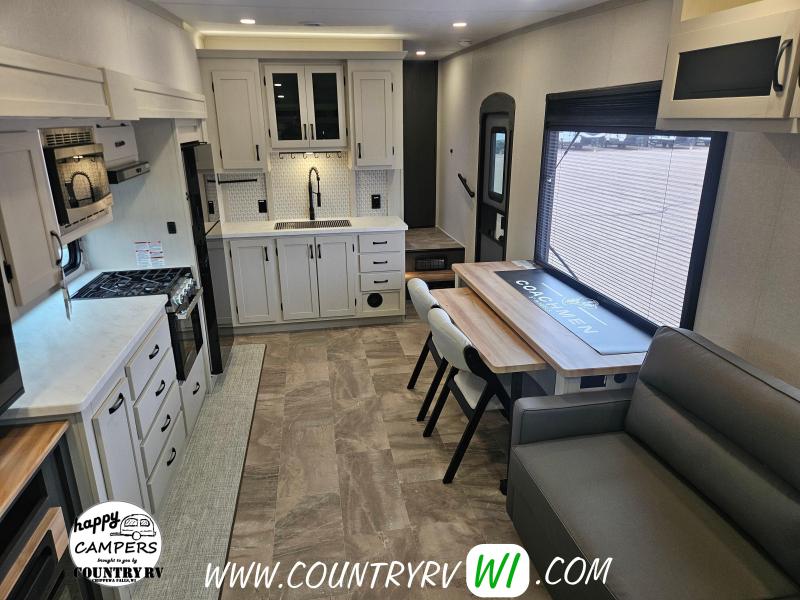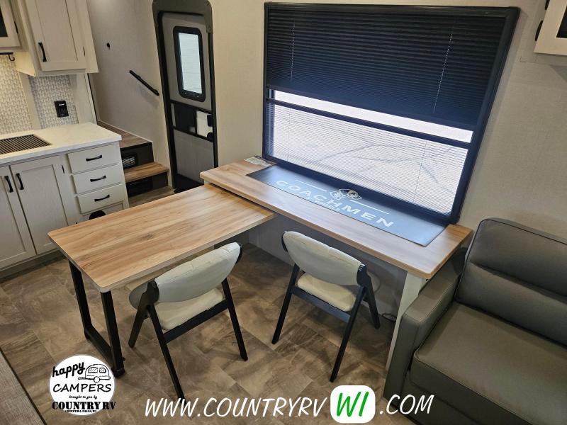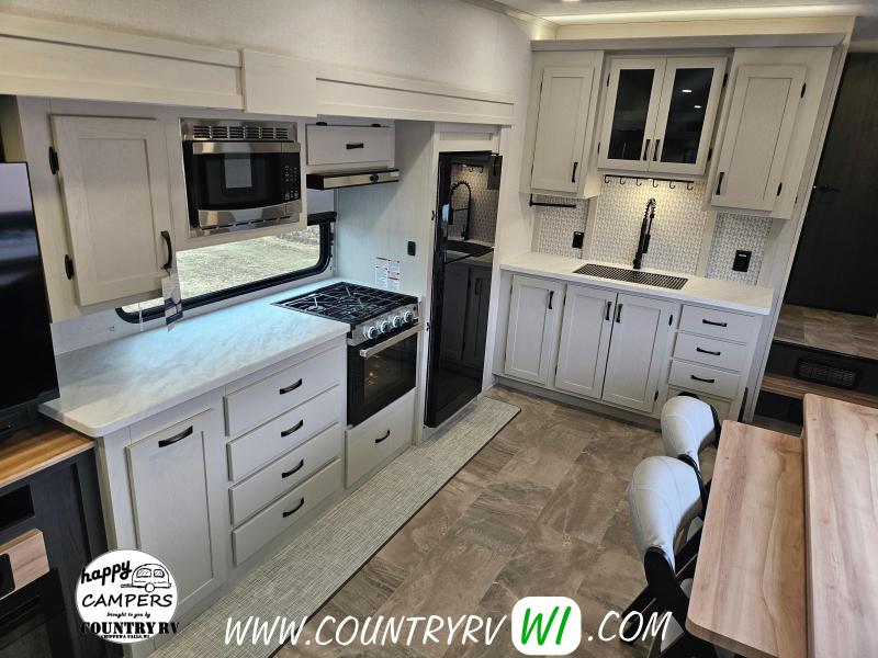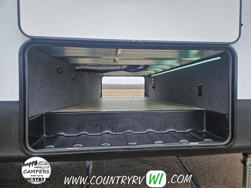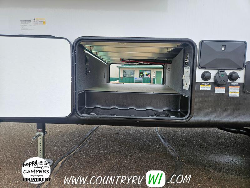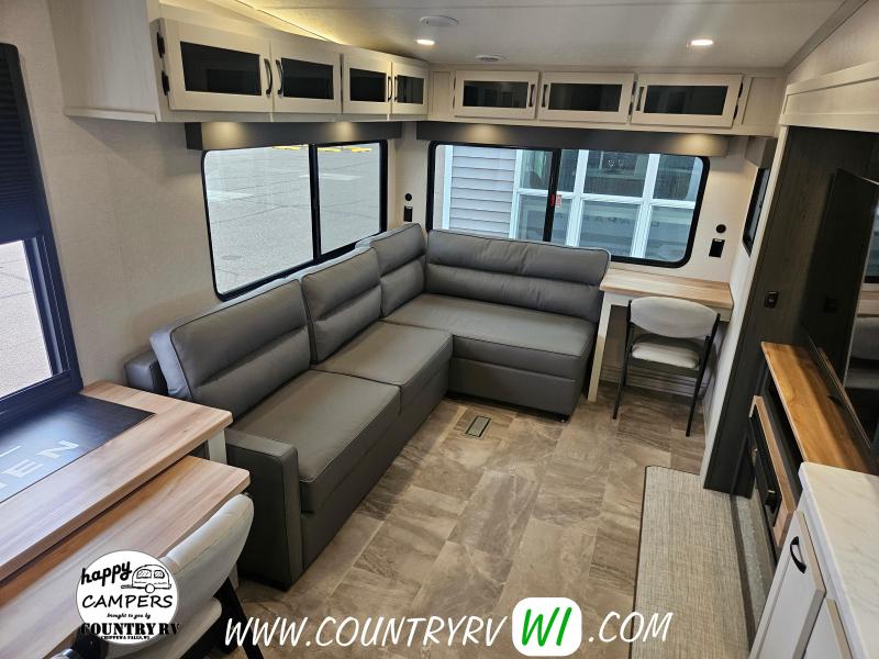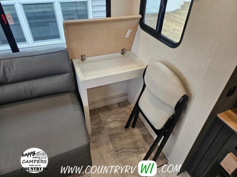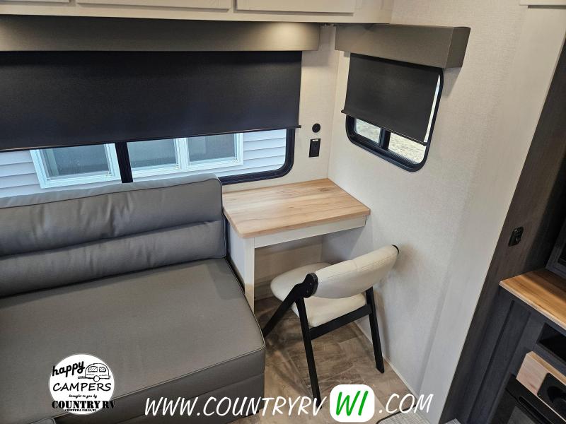NEW LAYOUT! This rear living floorplan adds a fresh twist with a larger L-shaped sofa that easily converts into extra sleeping space, along with a built-in desk perfect for work or relaxing. The entertainment center swivels forward, allowing you to adjust the TV for a better viewing angle while revealing generous hidden storage behind it. A new multi-function slide/swivel table adds versatility, complete with a built-in bug screen, and this model also offers an optional exterior door that opens up your view of the campsite and creates an additional outdoor entertaining space. Moving upstairs, the open pass-through bathroom makes the layout feel spacious, and the bedroom slide provides plenty of room for toiletries along with a large wardrobe, giving you more storage than you’d expect in a 5th wheel.