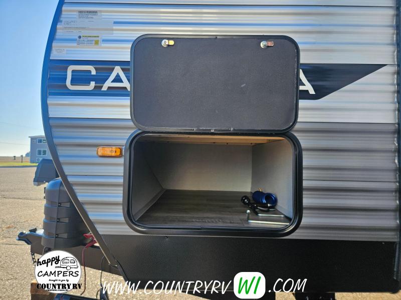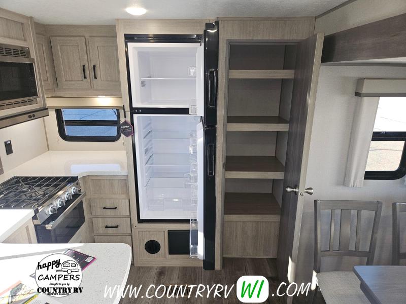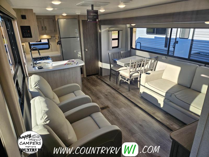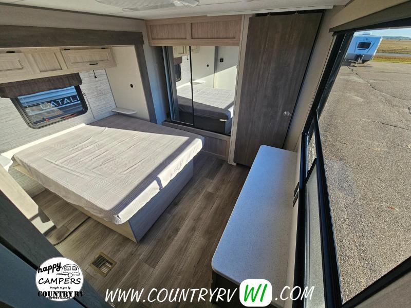 The 2026 Catalina Legacy 303RKDS Travel Trailer packs more features into its package than most. The rear kitchen boasts a U-shaped counter, providing ample workspace along with multiple upper and lower cabinets for storage. An uncommon door-side view in the living room offers a great line of sight from both the dining table and sofa. Relax in the two individual recliners, which move independently so each person can choose their preferred view. The large bathroom features an XL shower and an added linen cabinet, maximizing both comfort and storage. The bedroom is a standout feature, with a bed slide and spacious closets that provide plenty of storage options. There’s even space for a washer and dryer if desired, making it perfect for extended stays or full-time living.