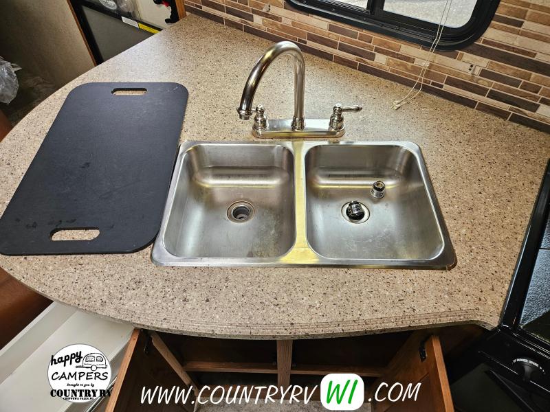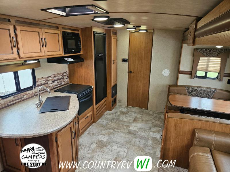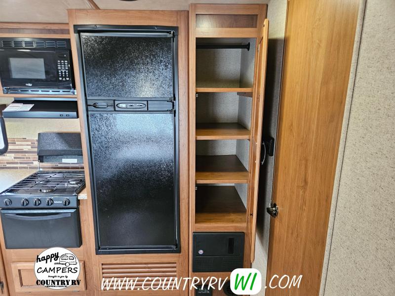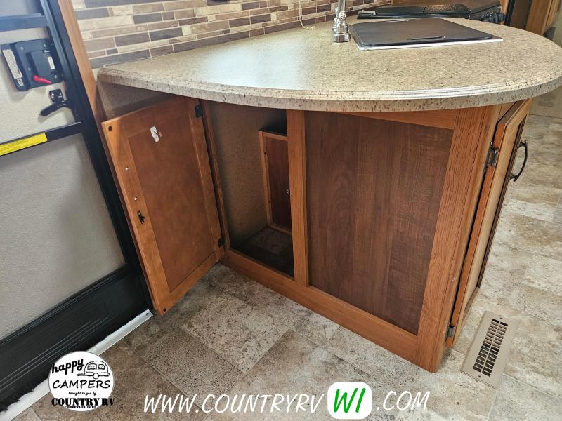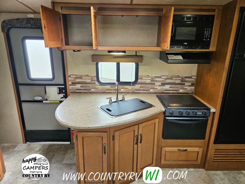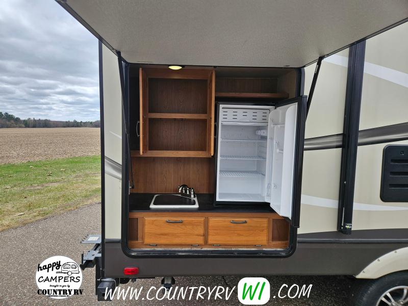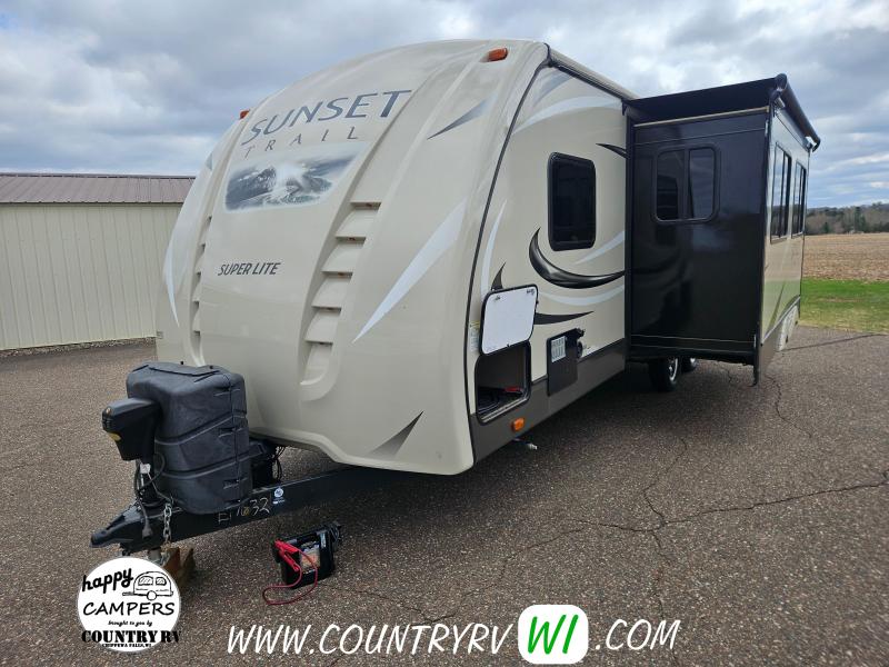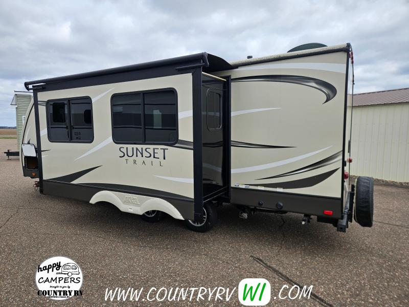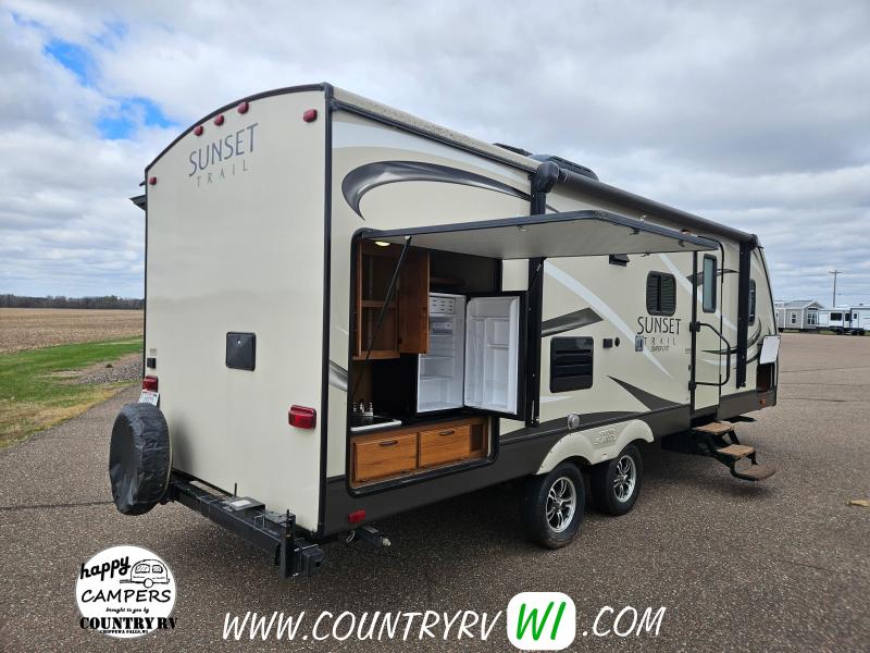 2017 Sunset Trail 250RB travel trailer comes with a well-equipped outdoor kitchen, featuring a sink, larger mini fridge, extra storage with cabinets, and an exterior grill mounted on the back. The grill easily swings forward next to the outdoor kitchen with a simple quick-connect for your propane. Perfect for entertaining outdoors! Inside, the master bedroom offers pocket doors on either side, a residential 60" x 80" queen bed, and a versatile entertainment center that swivels for viewing in both the bedroom and living area. The kitchen includes a dual-basin sink, wrapped countertops (no shrinking trim issues), a large pantry, and pull-out bins under the dinette, providing ample storage space. The bathroom features an extended countertop and a larger shower, offering more comfort than typical corner showers. Additional features include a dinette and sofa that provide extra seating and convert into additional sleeping space when needed. This trailer combines practical storage, spacious living areas, and outdoor convenience, making it an excellent choice for families or weekend getaways.