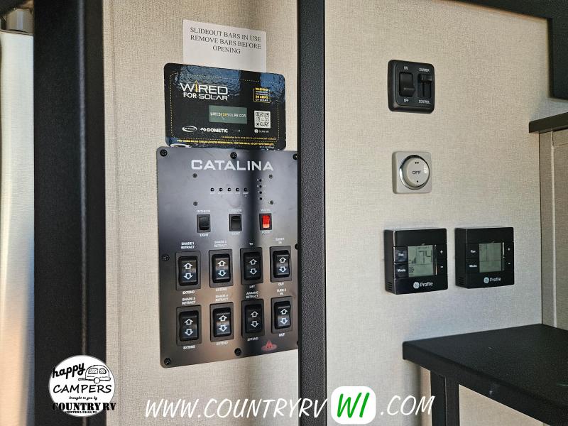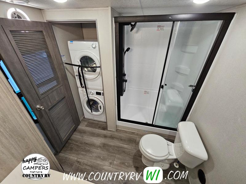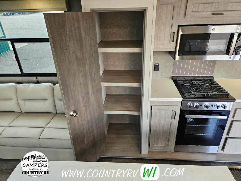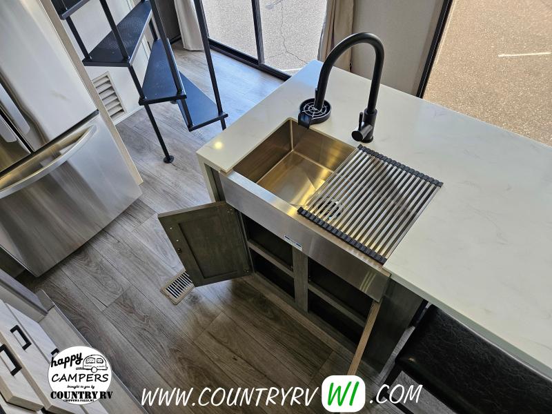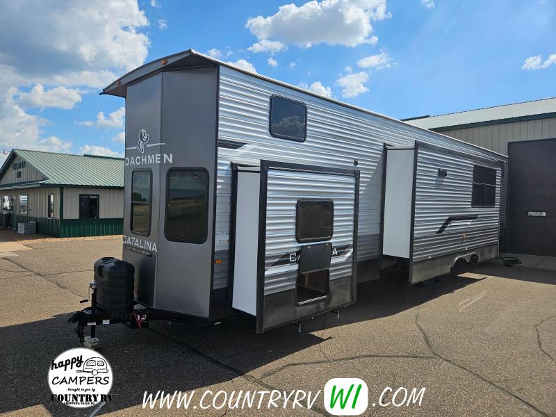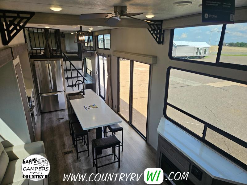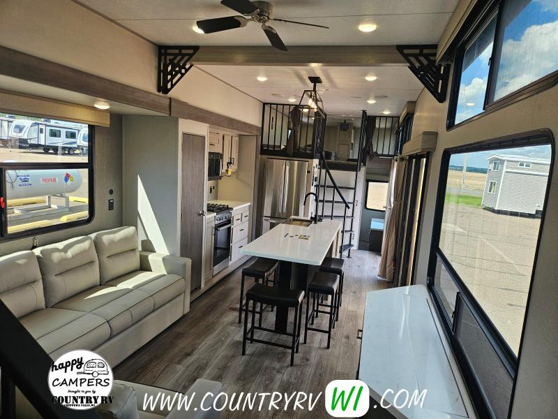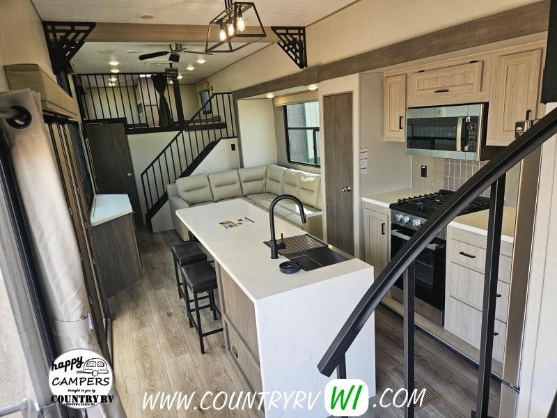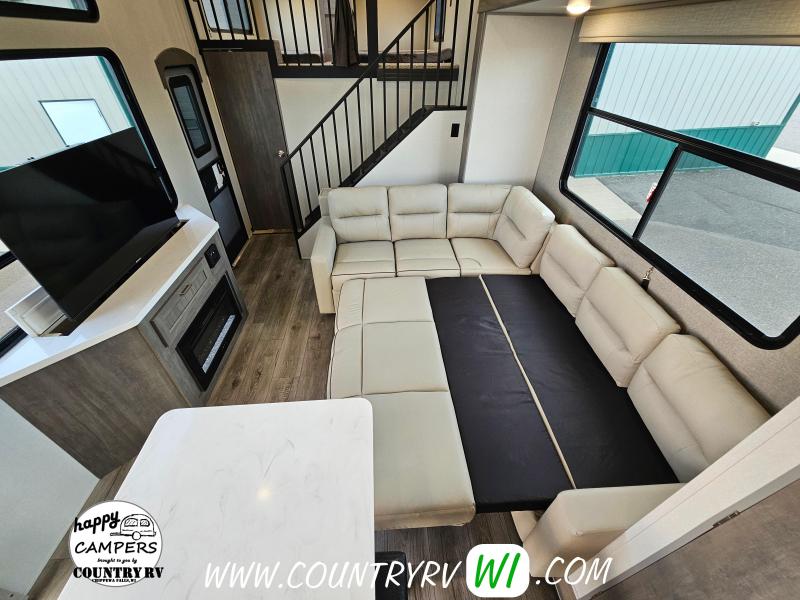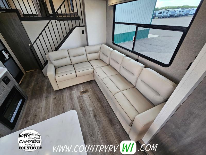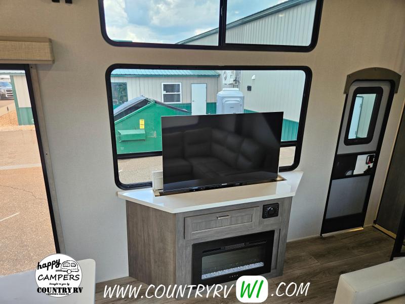 The 2025 Catalina 42 Condo introduces an innovative floor plan that maximizes sleeping capacity while preserving an open, couple-friendly layout. The lofted area comfortably sleeps up to five and features clever storage solutions, making it ideal for families or groups. At the front, the private bedroom includes its own slide-out, creating a spacious retreat enhanced by a cozy fireplace that adds warmth and charm. The island kitchen offers generous countertop space, ample storage, and residential-style features that elevate your culinary experience. The living area is filled with natural light from abundant windows and includes a smart entertainment setup—complete with a TV that discreetly lowers into the cabinet when not in use. A large sectional sofa adds comfort and converts into a massive sleeping area, perfect for hosting guests. Step down into the rear bathroom and you’ll find a roomy shower, plenty of floor space, and washer/dryer prep that can also serve as extra storage. This thoughtfully designed unit redefines destination camping with comfort, creativity, and functionality—perfect for making the most of your seasonal adventures.