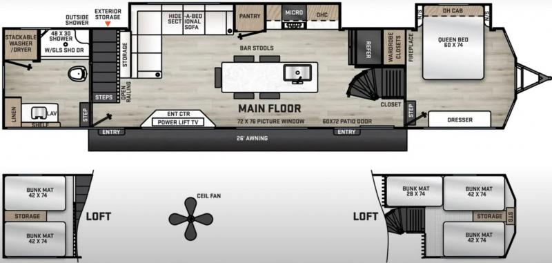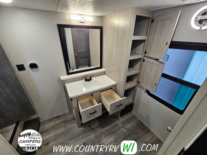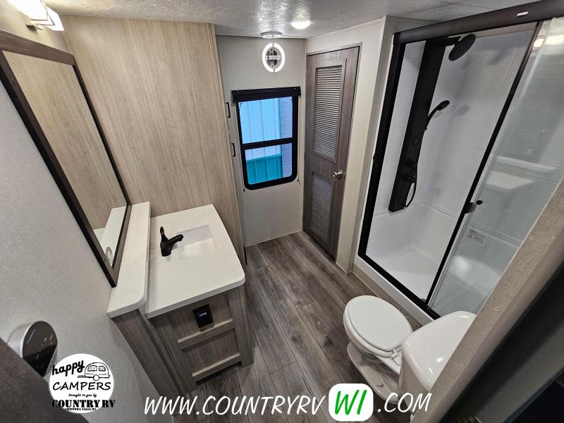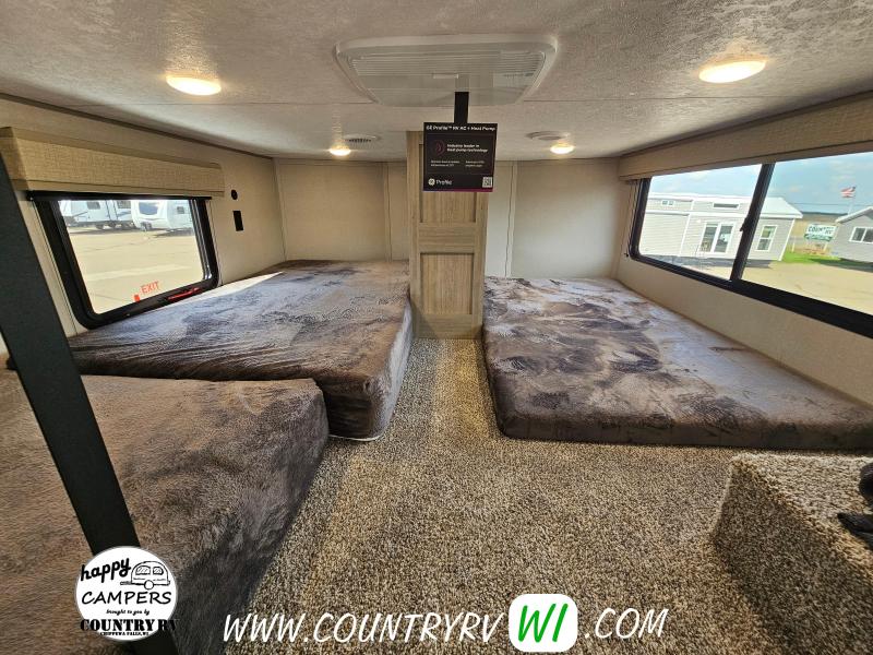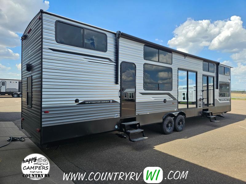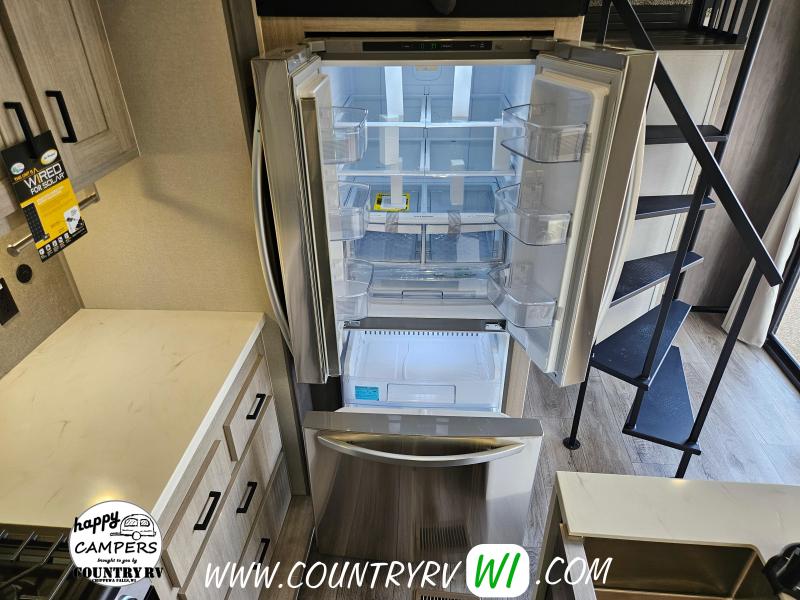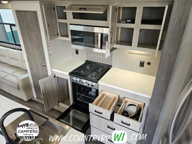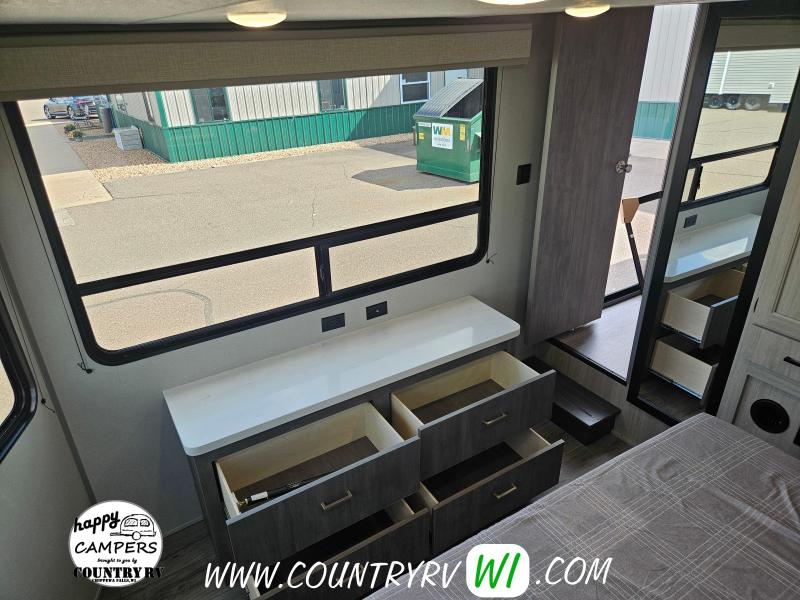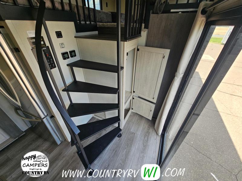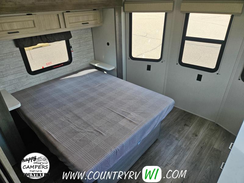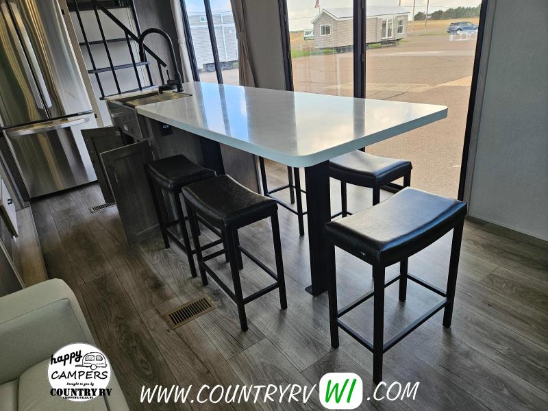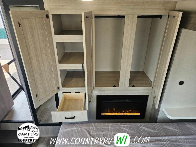 The 2025 Catalina 42 Condo introduces an innovative floor plan that maximizes sleeping capacity while preserving an open, couple-friendly layout. The lofted area comfortably sleeps up to five and features clever storage solutions, making it ideal for families or groups. At the front, the private bedroom includes its own slide-out, creating a spacious retreat enhanced by a cozy fireplace that adds warmth and charm. The island kitchen offers generous countertop space, ample storage, and residential-style features that elevate your culinary experience. The living area is filled with natural light from abundant windows and includes a smart entertainment setup—complete with a TV that discreetly lowers into the cabinet when not in use. A large sectional sofa adds comfort and converts into a massive sleeping area, perfect for hosting guests. Step down into the rear bathroom and you’ll find a roomy shower, plenty of floor space, and washer/dryer prep that can also serve as extra storage. This thoughtfully designed unit redefines destination camping with comfort, creativity, and functionality—perfect for making the most of your seasonal adventures.