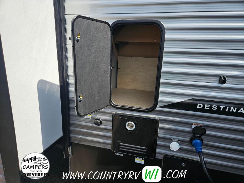 Destination Edition Value Package: Universal 600W Solar Prep w/ Installed Roof Panel Port, All-In-One Control Panel With Dimmer Switch, Siphon 360 Roof Vent, Glass Step-In Shower w/ ABS Surround, 5/8" Tongue and Groove Stabledeck Flooring, Bedroom USB and Outlets, Living Room and Master Bedroom Ceiling Fans w/ Wall Switch (N/A on all floorplans), Black Glass Friction Hinge Door(s), Power Vent Fan in Living Room AND Bathroom (Retail Value $2,299.00) Home Entertainment Package: JBL Aura Head Unit, 2 JBL Premium Interior Speakers, 2 JBL Premium Exterior Speakers, Full 4G LTE/Wifi Booster/Wifi Extender Prep, (Retail Value $499.00) General Electric Appliance and Kitchen Package - Destination: Stainless Microwave, 21" Stainless 3-Burner Gas Range with Metal Back-Lit Knobs, 15,000 BTU GE High Efficiency A/C With Heat Pump, 10 Gallon Gas/Electric DSI Water Heater, Thermofoil Countertops w/ Smooth Drop Edge, Deep Basin Farm Style Sink, Stainless Steel Drying Rack, Brick Backsplash, (2) USB and (2) 110 outlets (Retail Value $1,890.00) Extended Stay Convenience Package: Fireplace in Living Room, Tri-Fold Sofa, Serta Mattress, Washer/Dryer Prep (Per FP), LP Quick Connect, Exterior TV Hookups, Black Tank Flush, Hot/Cold Outside Shower, XL Grab Handle at Main Entrance, Battery Disconnect, 4,000 Lumen Interior Touch Lighting (Retail Value $1,225.00)