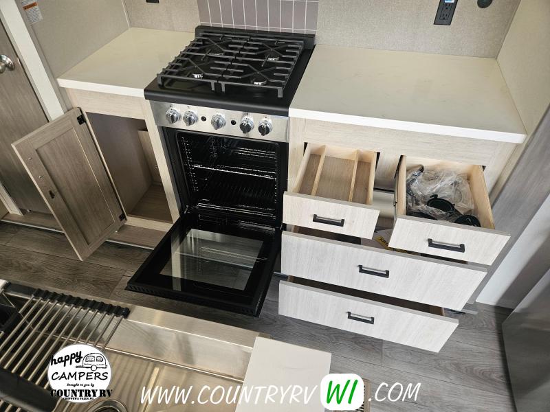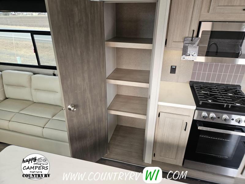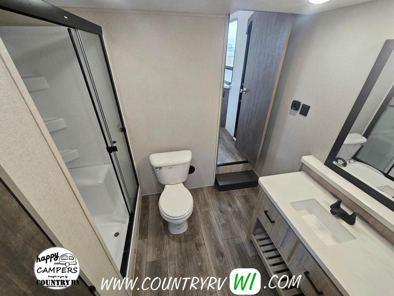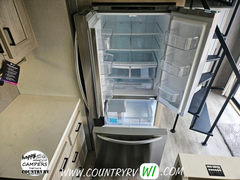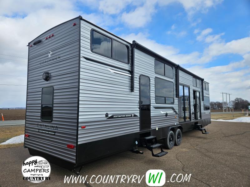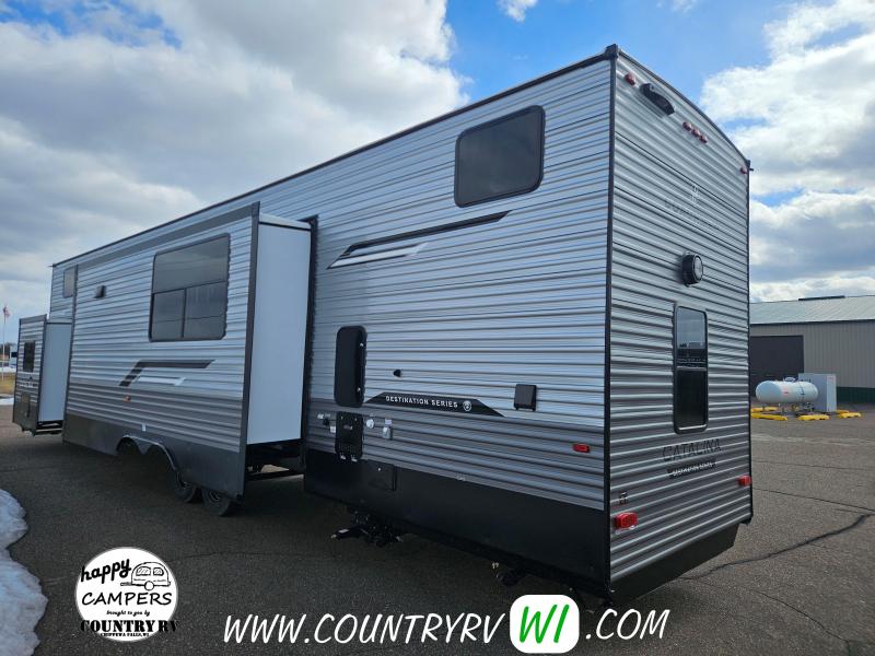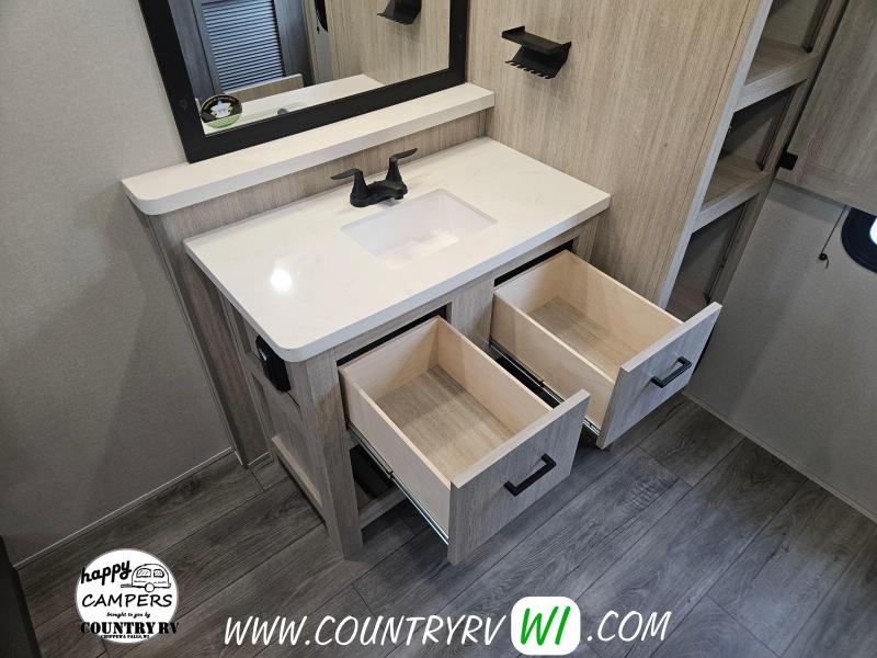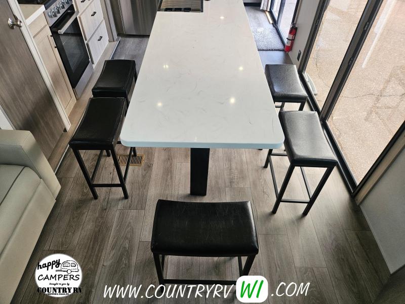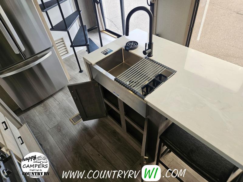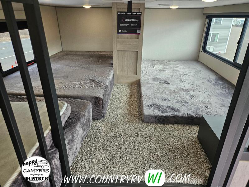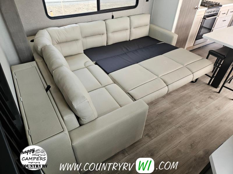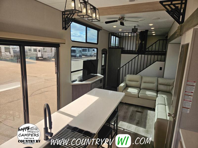 The 2026 Catalina 42 Condo introduces an innovative floor plan that maximizes sleeping capacity while preserving an open, couple-friendly layout. The lofted area comfortably sleeps up to five and features clever storage solutions, making it ideal for families or groups. At the front, the private bedroom includes its own slide-out, creating a spacious retreat enhanced by a cozy fireplace that adds warmth and charm. The island kitchen offers generous countertop space, ample storage, and residential-style features that elevate your culinary experience. The living area is filled with natural light from abundant windows and includes a smart entertainment setup—complete with a TV that discreetly lowers into the cabinet when not in use. A large sectional sofa adds comfort and converts into a massive sleeping area, perfect for hosting guests. Step down into the rear bathroom and you’ll find a roomy shower, plenty of floor space, and washer/dryer prep that can also serve as extra storage. This thoughtfully designed unit redefines destination camping with comfort, creativity, and functionality—perfect for making the most of your seasonal adventures.