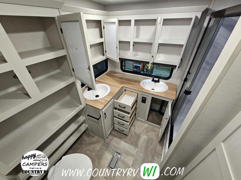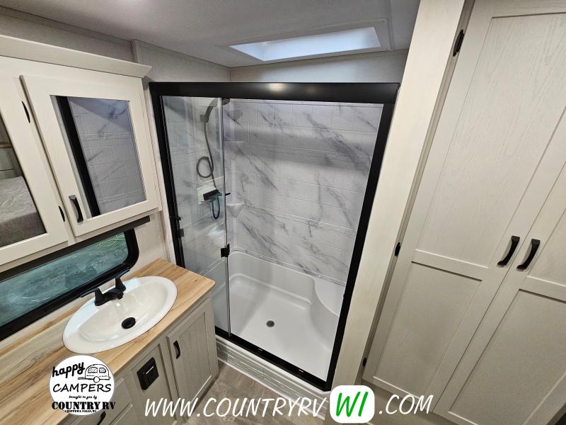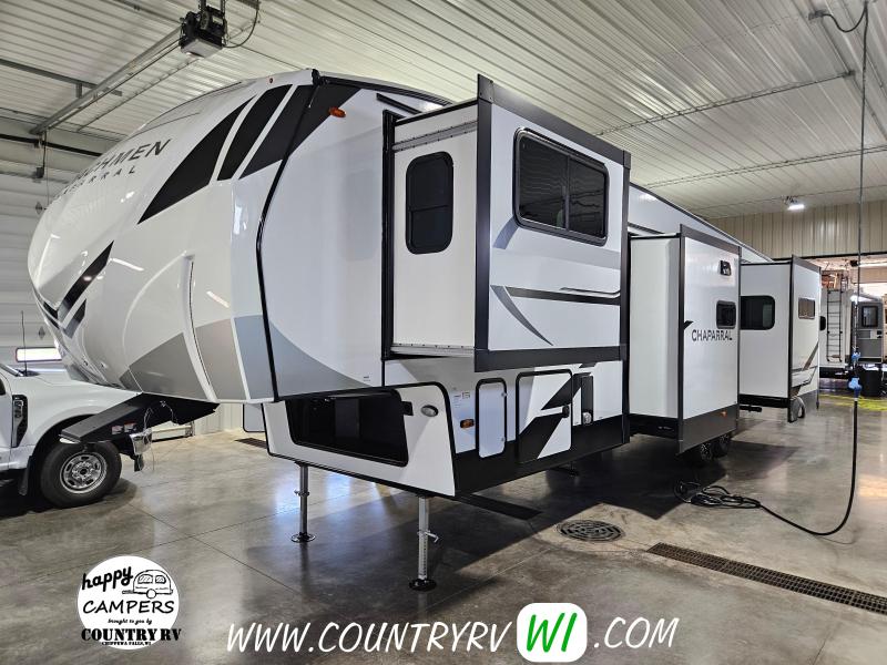 The Chaparral 334FL features a spacious front living room with opposing slides, dual hide-a-bed sofas, and comfortable recliners positioned perfectly across from the smart TV and large fireplace—creating the ultimate cozy retreat. The island kitchen is designed for convenience and style, with solid surface countertops, a residential refrigerator, and a generous pantry for all your storage needs. In the rear, the king bed slide provides ample space and storage, leading into a luxurious master bathroom complete with a porcelain toilet, dual sinks, washer/dryer prep, and an oversized shower.