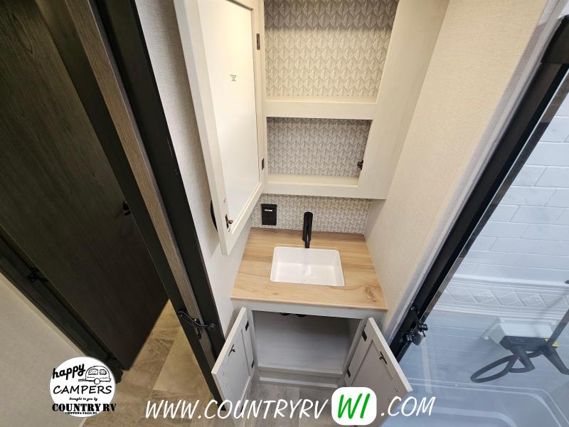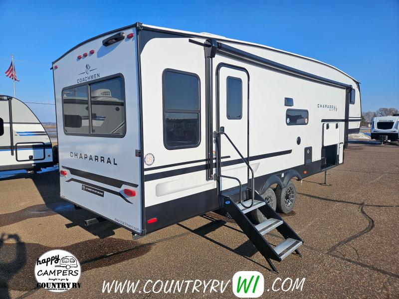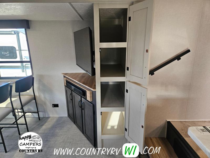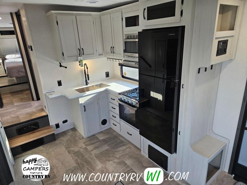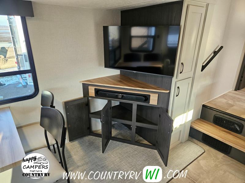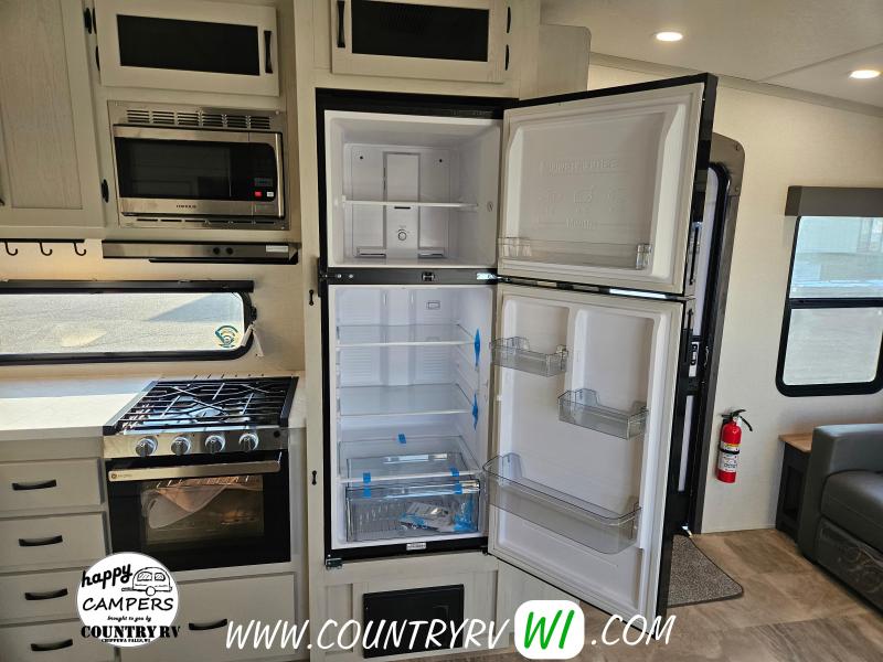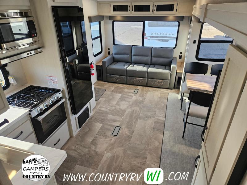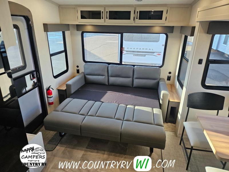 The Chaparral Lite introduces a new rear living floorplan for this year—new to the lineup but a layout that was extremely popular in past years. The rear sofa setup provides a great view of the corner entertainment center, and when guests stay over, the large hide-a-bed adds extra sleeping space. The freestanding table is a great feature for couples, allowing you to move the seating area wherever it feels most comfortable. The corner kitchen will surprise you with the amount of countertop space it offers, and as you walk upstairs, you’ll find a nicely sized shower that’s larger than most travel trailers. The master bedroom includes a residential 60" x 80" queen bed, and the wardrobe is a standout, offering far more space than the slim wardrobes typically found next to the bed.