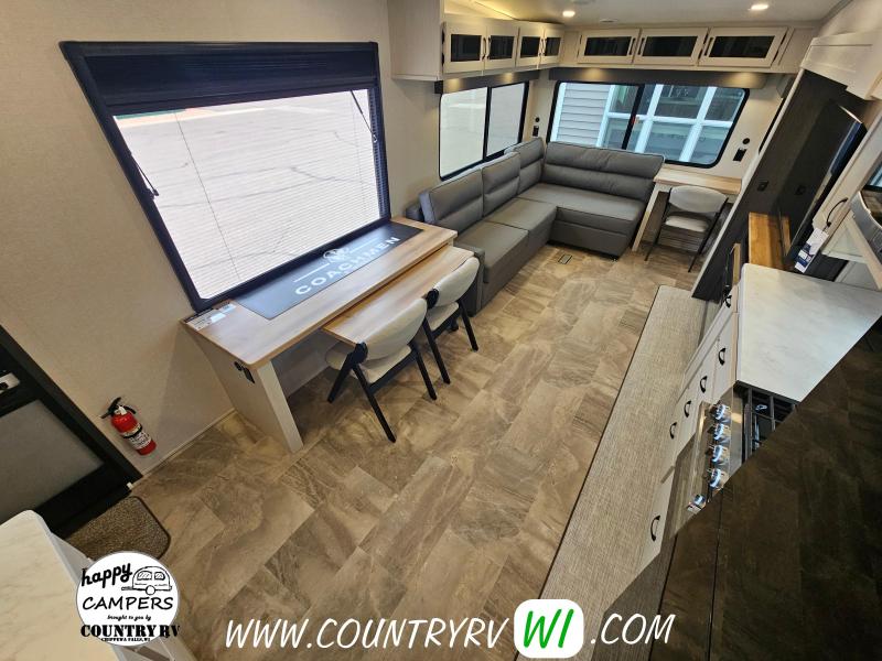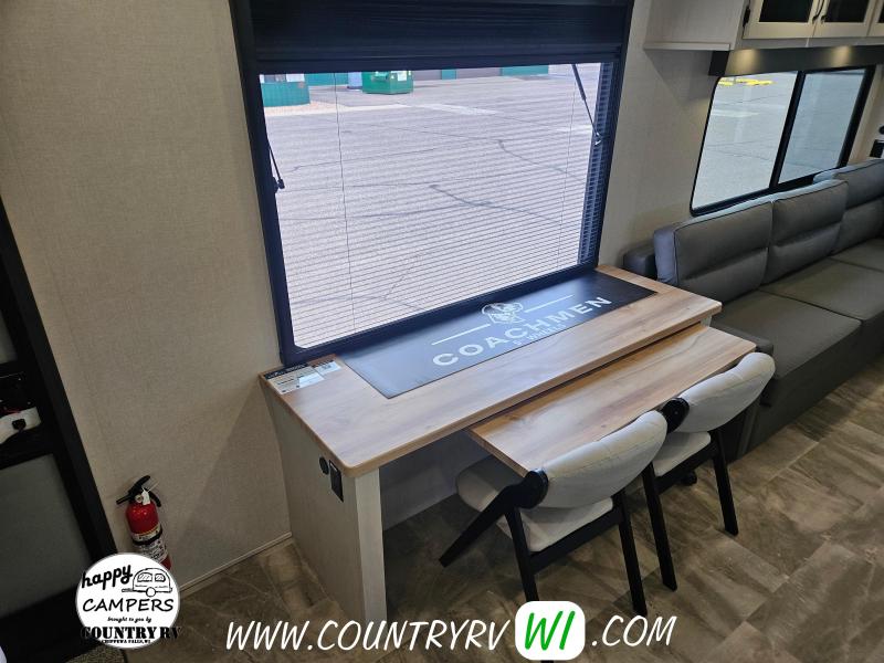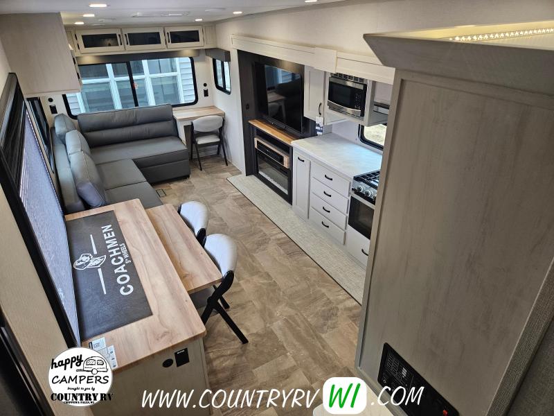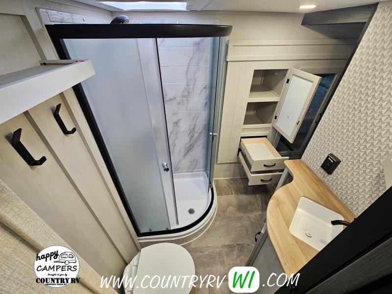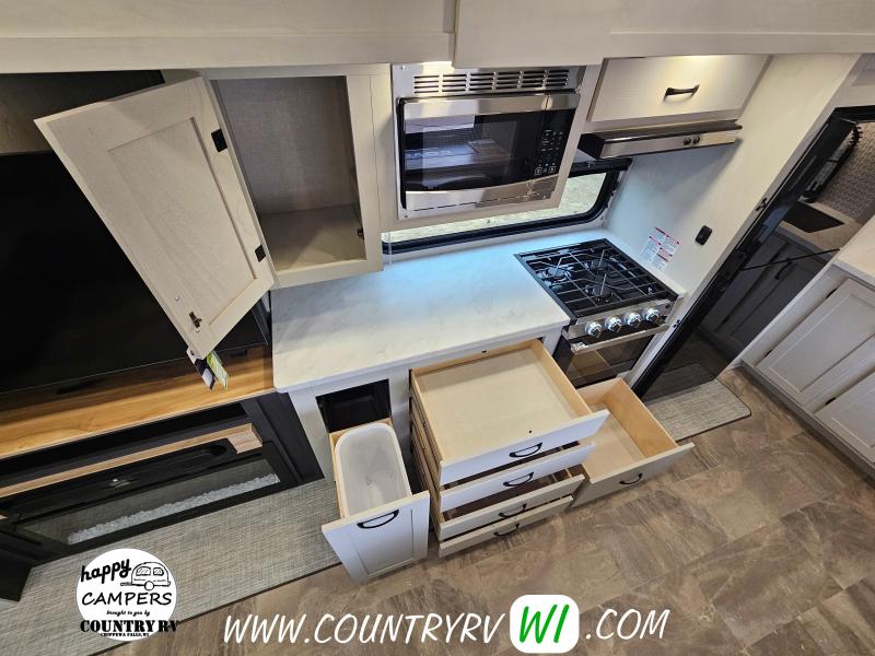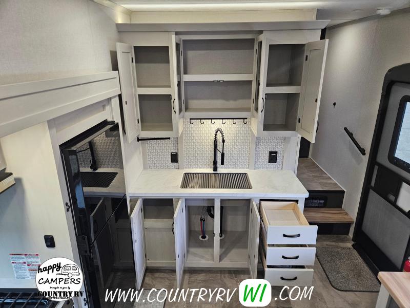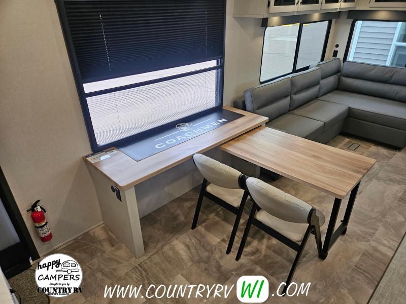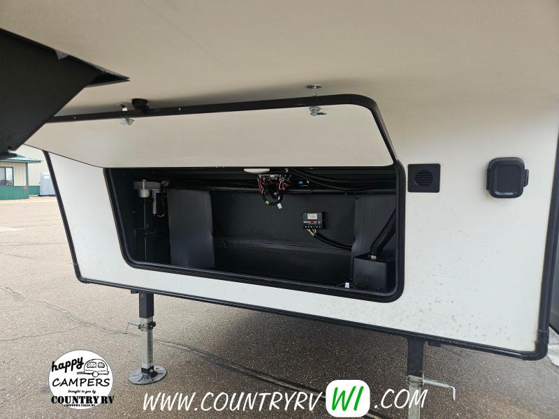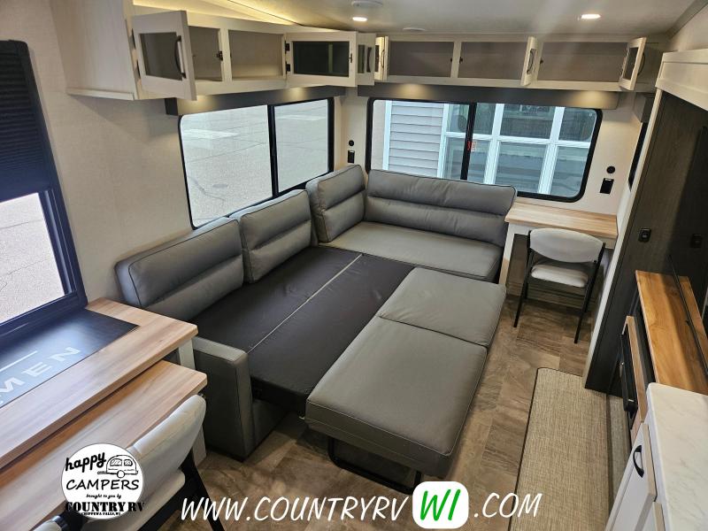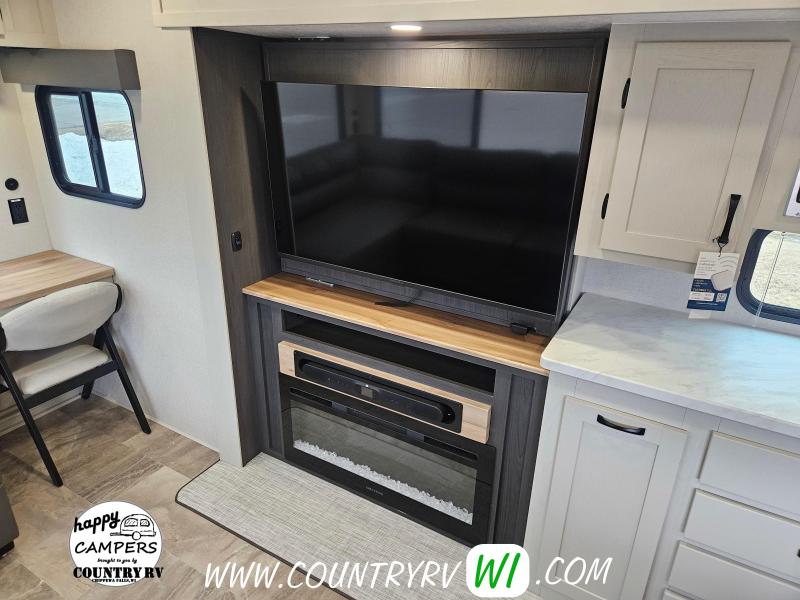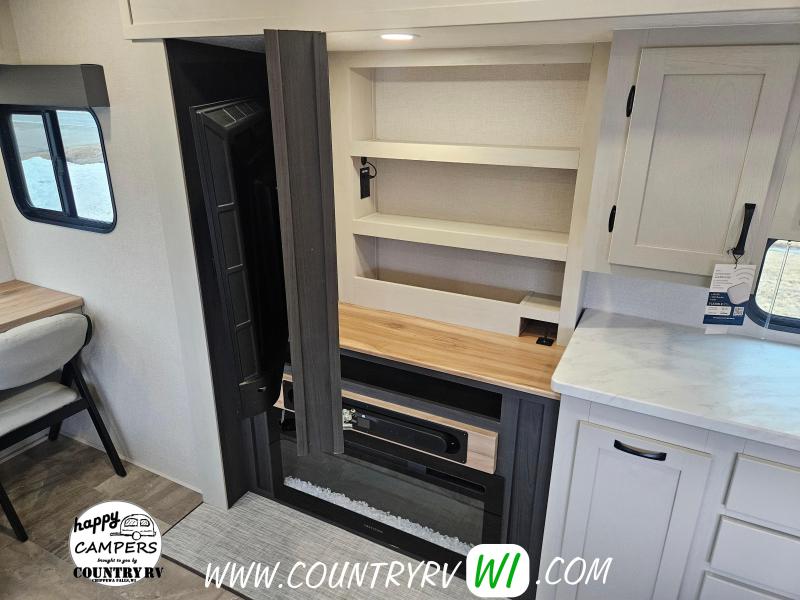 NEW LAYOUT! This rear living floorplan adds a fresh twist with a larger L-shaped sofa that easily converts into extra sleeping space, along with a built-in desk perfect for work or relaxing. The entertainment center swivels forward, allowing you to adjust the TV for a better viewing angle while revealing generous hidden storage behind it. A new multi-function slide/swivel table adds versatility, complete with a built-in bug screen, and this model also offers an optional exterior door that opens up your view of the campsite and creates an additional outdoor entertaining space. Moving upstairs, the open pass-through bathroom makes the layout feel spacious, and the bedroom slide provides plenty of room for toiletries along with a large wardrobe, giving you more storage than you’d expect in a 5th wheel.