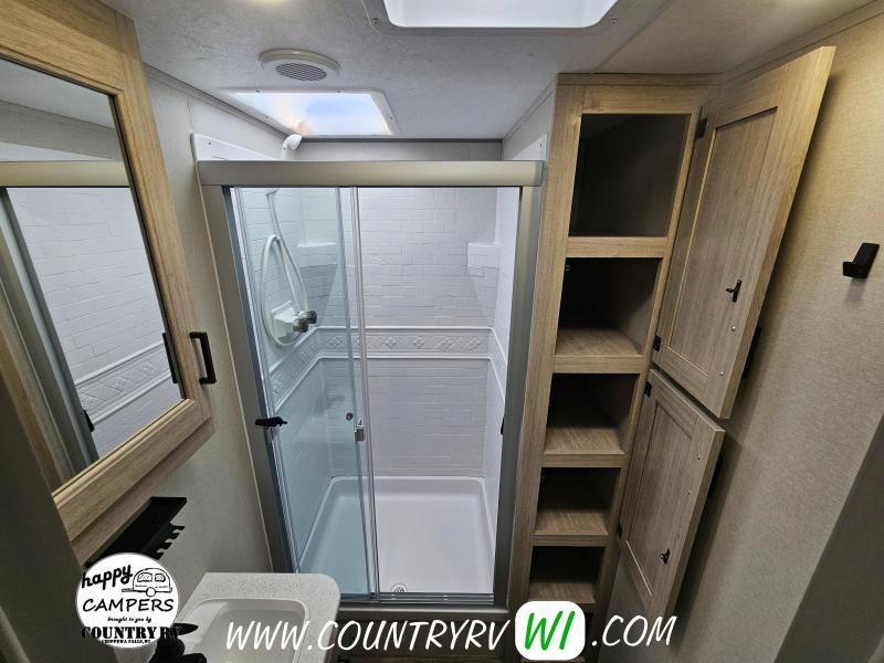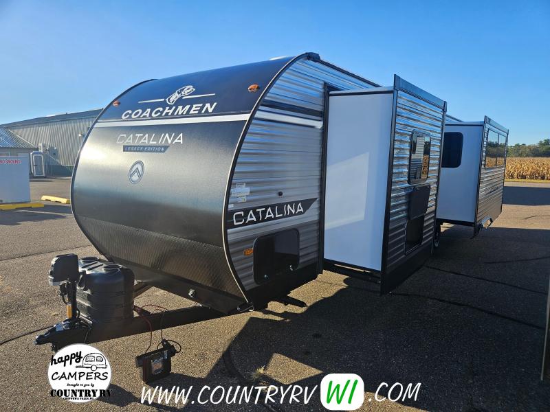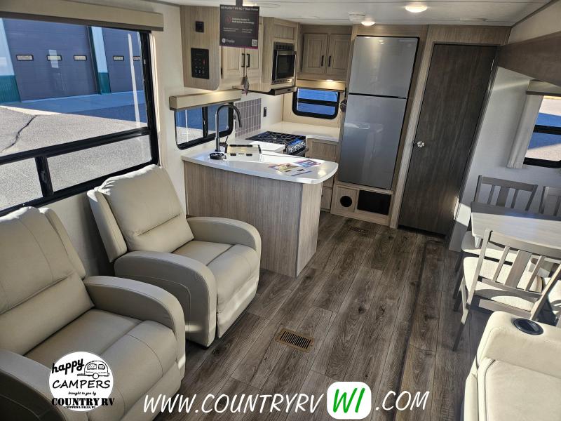 The 2026 Catalina Legacy 303RKDS Travel Trailer packs more features into its package than most. The rear kitchen boasts a U-shaped counter, providing ample workspace along with multiple upper and lower cabinets for storage. An uncommon door-side view in the living room offers a great line of sight from both the dining table and sofa. Relax in the two individual recliners, which move independently so each person can choose their preferred view. The large bathroom features an XL shower and an added linen cabinet, maximizing both comfort and storage. The bedroom is a standout feature, with a bed slide and spacious closets that provide plenty of storage options. There’s even space for a washer and dryer if desired, making it perfect for extended stays or full-time living.