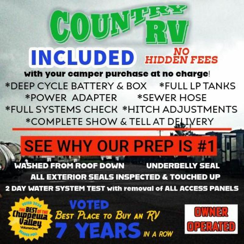 Country RV Facebook PageCountry RV, LLC of Chippewa Falls Wisconsin is your first choice for New, & Clean Used RVs in Western Wisconsin. Live in Minnesota, we would love to help you come across the border and find you the best fit for you. Country RV, LLC is known for their customer service throughout the entire camping experience. Looking to buy? Looking to sell? Looking for Parts or Service, we can help you! We carry several new lines of travel trailers, park trailers, fifth wheels and park models. Our professional and trusted staff can help you with your needs today.